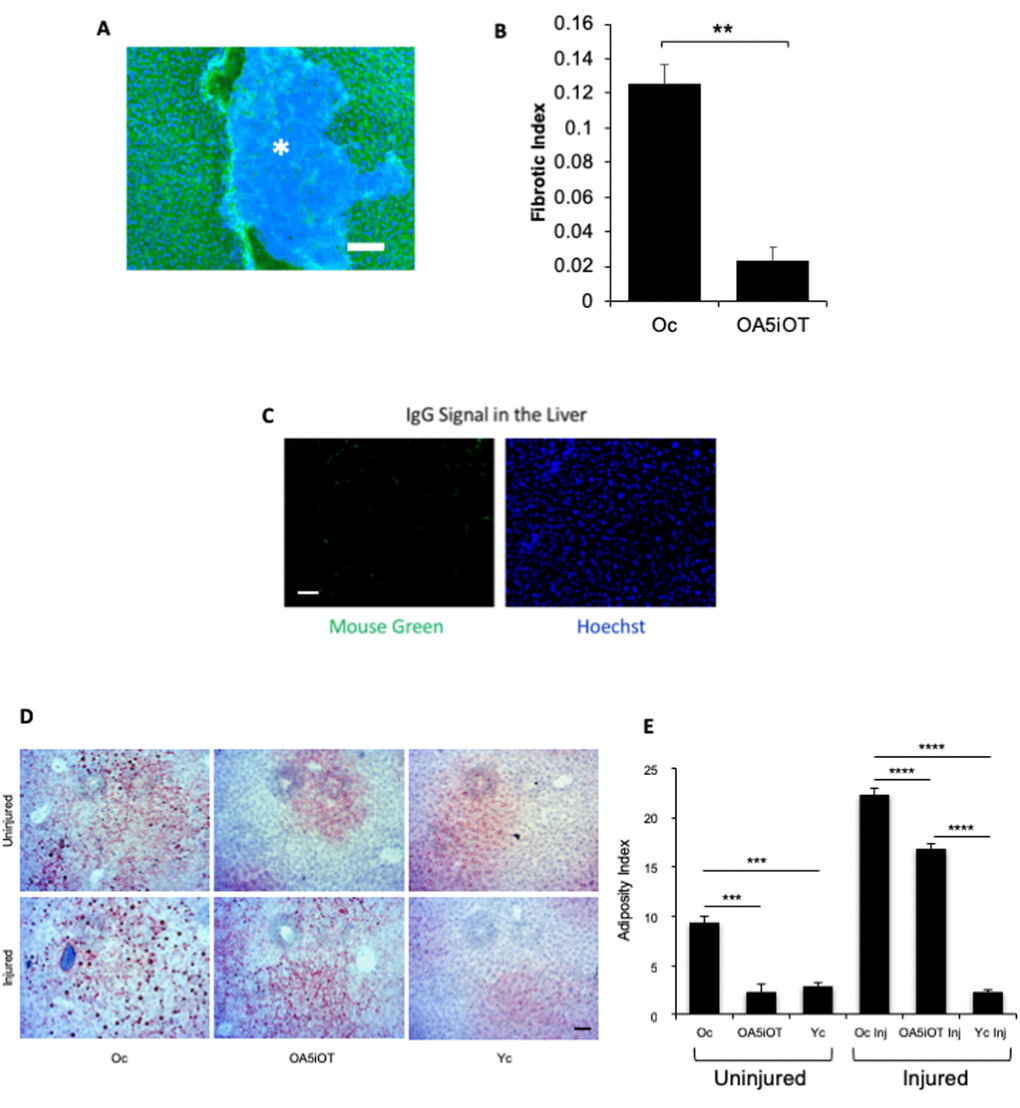 To evaluate the liver health, we performed immunofluorescence for albumin on 10-micron liver sections and quantified the relative number of albumin-negative fibrotic clusters. Additionally, liver adiposity was measured by Oil Red O staining in these tissue sections, as in [6,23]. As shown in Figure 4, the low dose of Alk5i combined with OT within one-week reduced the adiposity and fibrosis of old livers, making these more similar to control young mice. Additionally, muscle injury increased liver adiposity in the old mice (Figure 4).