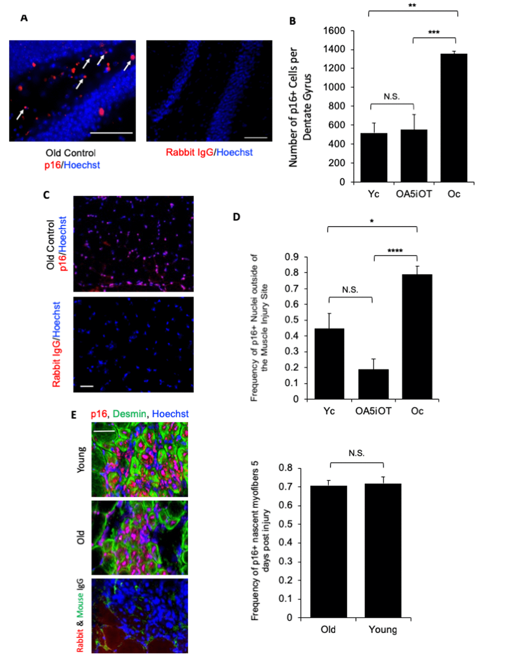 We examined the effects of in vivo administered Alk5i+OT on the number of p16+ cells in brain, muscle, and liver by p16-specific immunofluorescence on tissue sections. The p16 signal was nuclear as expected, and immunofluorescence from isotype-matched IgG controls was negligible (Figure 5). As shown in representative images, p16+ mono-nucleated cells were observed in the polymorphic region of the hippocampus near the Dentate Gyrus (Figure 5A), and the numbers of these p16 expressing cells were elevated in old mice as compared to young, and reduced in old animals that were administered with Alk5i+OT, as compared to the vehicle-treated old mice (Figures 5B). As compared to young muscle, higher number of p16+ mono-nucleated cells were also found in old TA muscle, outside of the injury sites; and the numbers of these p16+ cells declined in old mice that were administered with Alk5i+OT (Figure 5C and D).