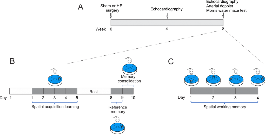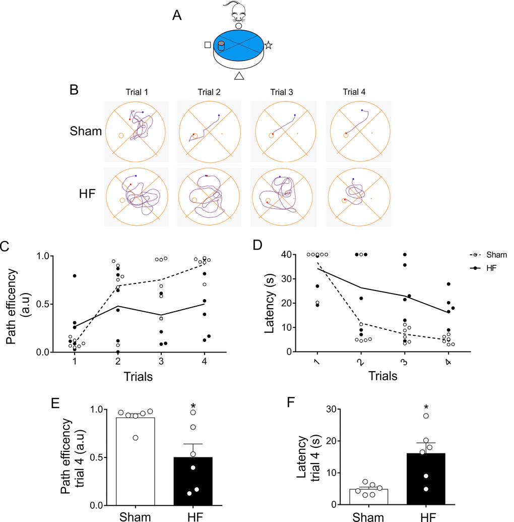 In the present study, we evaluate cognitive processes by conducting spatial learning and memory flexibility tests using the Morris water maze [48,49]. We found that HF rats presented a significative decrease in learning ability without overt evidence of sensorimotor deficits. These results suggest that decreased performance observed in HF rats is dependent on hippocampally-dependent mechanisms.