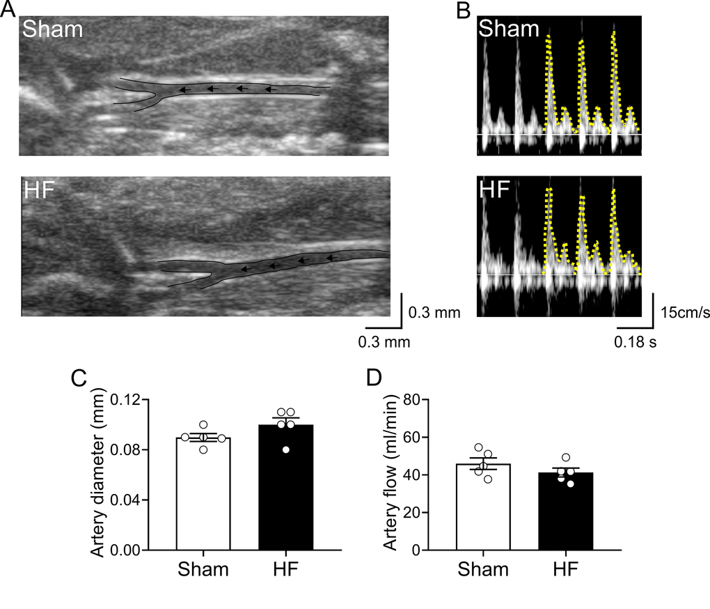 Experimental design and timeline of all assay are represented in Figure 1. Cardiovascular features of our HF model are shown in Table 1. Compared to Sham animals, HF rats displayed an increase end-diastolic diameter, end-diastolic volume, end-systolic diameter, end-systolic volume and stroke volume without significant differences in ejection fraction, (EF, 80.3 ± 5.3 vs 74.1 ± 8.9%; Sham vs. HF, respectively, p>0.05). Accordingly, HF rats showed overt signs of cardiac hypertrophy compared to Sham rats, as evidenced by a significant increase in the heart weight to body weight ratio (HW/BW, 2.7 ± 0.4 vs. 4.4 ± 0.5 mg*g−1; Sham vs. HF, respectively, p<0.05). No significant changes in body weight were observed between groups from the beginning to the end of behavioral tests (Table 1). In terms of cardiovascular baseline parameters, HF rats displayed a significant decrease in systolic blood pressure compared to Sham rats. Consequently, mean arterial blood pressure (MABP) was also decreased in HF rats compared to Sham rats (MABP: 101.1 ± 1.5 vs. 89.9 ± 8.3 mmHg; Sham vs. HF; p<0.05). In addition, HF rats displayed lower resting heart rate compared to control rats. In addition, carotid artery blood flow in Sham and HF rats was used as a surrogate for the estimation of blood perfusion to the brain region (Figure 2). No significant differences in both carotid artery diameter (Figure 2A and 2C) neither in carotid artery blood flow (Figure 2B and 2D) were found between Sham and HF group.