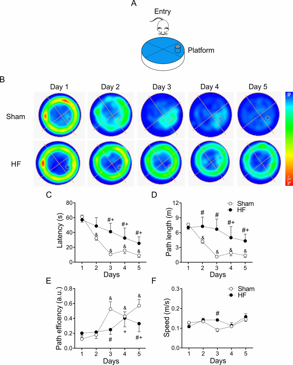 At day 3 (Figure 1C), when experimental design allows to better characterize the search strategy the animal employs in memory trials (Figure 6A), HF rats displayed a significant decrease in mean path efficiency compared to Sham rats (Figure 7A-C). Accordingly, HF rats showed increases in the mean time required to reach the platform when compared to the times obtained in Sham rats (Figure 7D).