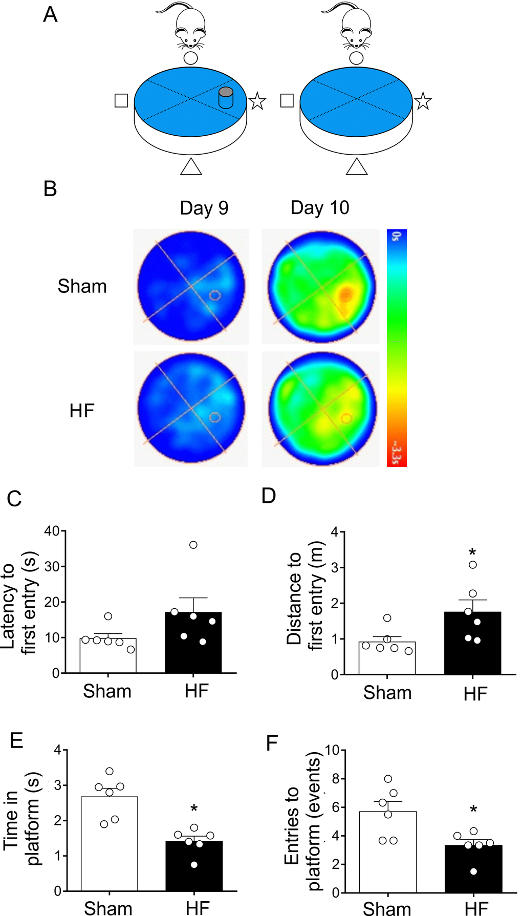 The probe trial provides an index of the animal tendency to persist around the platform previous location and it is generally considered to be a measure of memory retention [33]. At day 9, both sham and HF rats learned where is the platform, therefore they reach the platform in less time. However, at day 10 the platform is removed from the pool to measure spatial bias (Figure 5A). Compared to Sham rats, HF rats displayed an increase in both, the latency to the first entry (Figure 5B and 5C) and in the swam distance to first entrance (Figure 5B and 5D) in the zone of the previous target quadrant. Additionally, the time spent in the target quadrant (or zone around the platform) (Figure 5A and 5E) and number of platform location crossings were both decreased in HF animals compared to Sham animals (Figure 5A and 5F). These data strongly suggest that HF rats display a loss of memory consolidation.