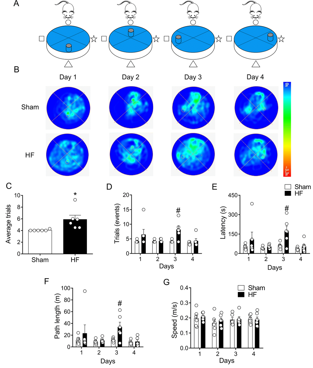After two days of rest, same rats were subjected to memory flexibility (MF) test, a variant of MWM (Figure 6A). This test measures the ability of the rats to find a new platform location using the procedural knowledge and spatial cues already learned in the reference memory version of the task [34]. As shown in Figure 6, Sham rats continuously decreased the number of trials required to complete the task, whereas rats with HF showed a reduced improvement when performing the task. Indeed, at day 3 of testing HF rats needed almost twice the number of trials to accomplish the task when compared to Sham animals (Figure 6D). In addition, a significant increase in time (Figure 6E) and mean traveled distance (Figure 6F) to reach the platform in each trial was observed in HF rats compared to Sham rats. This difference indicates that HF rats displayed memory impairment. No differences on average speeds when performing the tests were found between groups. This strongly suggest that HF rats and Sham rats displayed similar motor activity. Then, the data obtained strongly reflect memory impairment in HF rats.