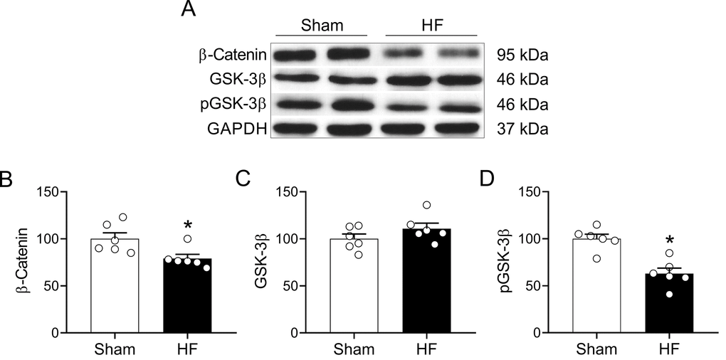 Wnt signaling play an important role in the development of the nervous system and participates in the adult brain structural and functional regulation of synapses [25,27]. Importantly, canonical Wnt signaling participate in hippocampal-dependent learning and memory processes [36]. Therefore, we evaluated whether HF may affect canonical Wnt signaling in the hippocampus. HF rats displayed decreased level of β-catenin (100.0 ± 6.3 vs. 79.1 ± 4.3% of sham; Sham vs. HF, respectively; p<0.05, Figure 8A and 8B) along with reduced level of phosphorylated GSK-3β (phospho-Ser-9) (100.0 ± 4.8 vs. 62.9 ± 5.9% of sham; Sham vs. HF, respectively; p<0.05, Figure 8A and 8D) suggesting an increased activity of the GSK-3β enzymatic complex. No changes in total GSK-3β levels were found between groups (Figure 8C).