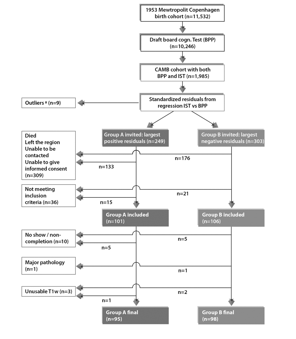 In order to optimize the possibility of cognitive ability in a late-midlife being found to be associated with biological (or other) correlates, we exploited the long-term nature of this study to identify individuals with a relatively large decline in cognitive ability from early-adulthood (“decliners”), and those who show improvement (“improvers”). This standard approach, formally known as the Extreme Groups Design (EGD) [75], also maximizes the subject variability in other relevant factors such as education attainment, occupational complexity and levels of motivation, increasing the generalizability of this study to the real population. That is, in what is otherwise a highly homogenous cohort, the EGD attenuates the commonly observed selection bias of self-selected healthy study samples towards high-functioning and educated individuals. Further benefits of using this cohort are manifold. First, there is a lack of evidence suggesting that pathological change abruptly begins at old age after a period of relative stability. Thus, inclusion of childhood, youth and late midlife cognitive scores in aging studies may be key to predicting later-life health outcomes [8,13,67,68]. Second, a homogenous, late-midlife cohort provides conditions that are optimal for assessing the influence of potential candidate determinants on late-life morbidity without confounding cohort or other age factors. Third, findings from the extant literature exploring brain markers of developmental and aging processes have described age-associated changes as “early development in reverse” [42,64,66]. Thus, phenotyping across the human lifespan and not just the extremes of the age-range is optimal when exploring normative or pathological brain aging patterns [9,15,37,68,69,76]. Specifically, if the brain’s ‘blueprint for aging’ has already developed by preschool years, the conservative approach of selecting the oldest of old to expose biomarkers of normative aging is an outdated one [25–27]. Lastly, even when data are derived from a longitudinal study, many factors (demographic, lifestyle etc.) that may contribute to the observed heterogeneity in aging trajectories are ignored which ultimately undermines the reliability of the relationships discovered.