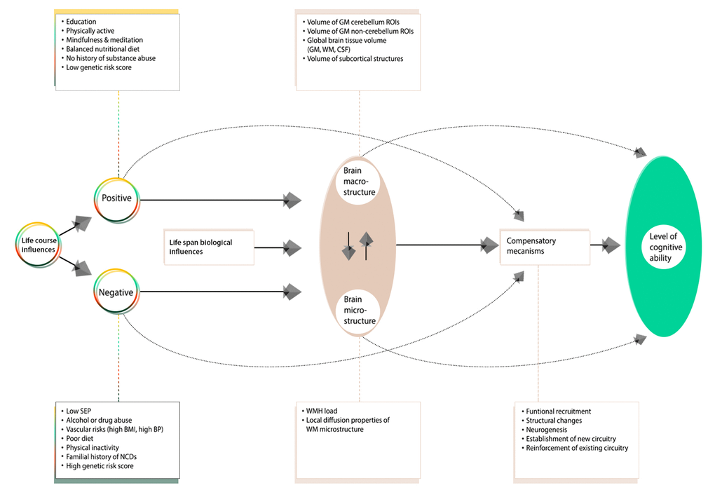 Given the complexity of the aging process, at present there is no gold standard selection of age-related markers for assessing cognitive decline and disease progression in older adults [6–9,11–18]. Furthermore, with considerable individual variability observed in aging trajectories, identifying the various factors that may underlie this individualism has not been a trivial task [19]. Prior studies investigating lifespan influences on non-pathological aging have identified childhood IQ, socioeconomic position (SEP), and genetic markers as some of the most consistent predictors of later-life health outcome [6,8,12,14,20–31]. In particular, of these, childhood cognitive ability has been identified as the strongest determinant of later-life intelligence explaining ~50% of the variance in cognition even at age ~80 [9,25–27]. Consequently, a series of other possible determinants (physical activity, tobacco smoking, hypertension, obesity, reduced cardiac output, nutrition), with smaller, but significant effects on cognitive function and brain aging have been identified that may explain the remaining variability [6–11,17,18,22,32–35]. However, many of these measures have been branded as proxy markers of lower early-life intelligence.