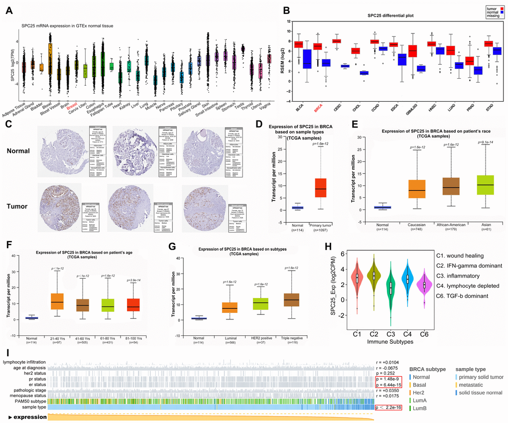 TCGAportal (http://www.tcgaportal.org) and FIREBROWSE (http://firebrowse.org/) were used to investigate the expression of SPC25 in different tumor tissues and corresponding para-carcinoma tissues. The Human Protein Atlas (https://www.proteinatlas.org/) database contains pathology and gene information from many reports on various tissues and cells. We used it to examine SPC25 expression in different tissues and the location of SPC25 mRNA within cells. Next, we compared SPC25 expression in BC patients of different races, ages, and molecular subtypes using UALCAN (http://ualcan.path.uab.edu/). The Wilcoxon rank sum test was used to assess the significance of observed differences.