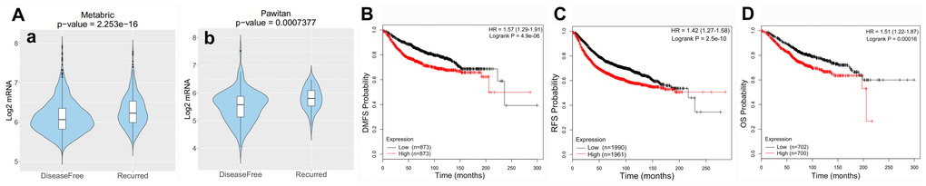 The prognostic potential of SPC25 in BC was further examined using CANCERTOOL and Kaplan-Meier Plotter. Results indicated that patients with higher SPC25 expression had higher recurrence rates as well as shorter DMFS, RFS, and OS (Figure 2).