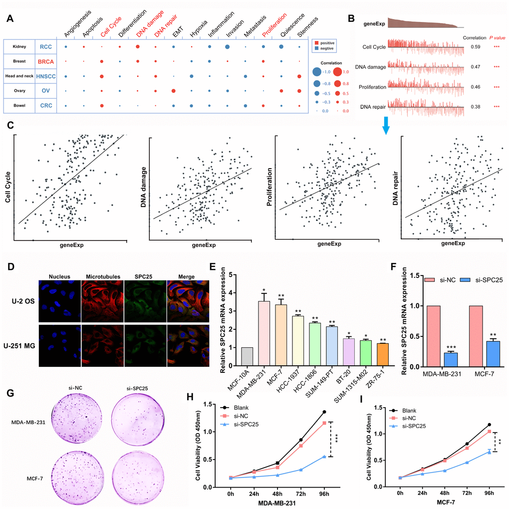 In a previous study, SPC25 expression was higher in basal breast cancer subtypes compared with other subtypes, suggesting that it might play a key role in basal stem cell-driven breast cancer [9]. In this study, we investigated SPC25 expression in breast cancer (BC) and in various other human cancer types and found that SPC25 expression was upregulated in multiple tumors. To further examine the effects and predictive value of elevated SPC25 levels, we performed an analysis using CancerSEA. The results indicated that SPC25 might influence BC development and progression by regulating the cell cycle, DNA damage and repair, and cell proliferation.
