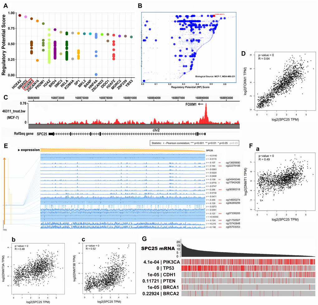 The Cistrome DB Toolkit database (http://dbtoolkit.cistrome.org) allows users to query transcription factors (TFs) that might regulate genes of interest to identify binding factors, histone modifications, and chromatin accessibility in a genomic interval of interest up to 2 Mb in length. ChIP-seq, DNase-seq, and ATAC-seq samples with the most similarities are determined based on overlap with the user-provided genomic interval sets [26, 27]. We used the Cistrome DB Toolkit to predict which TFs are most likely to increase SPC25 expression in BC.