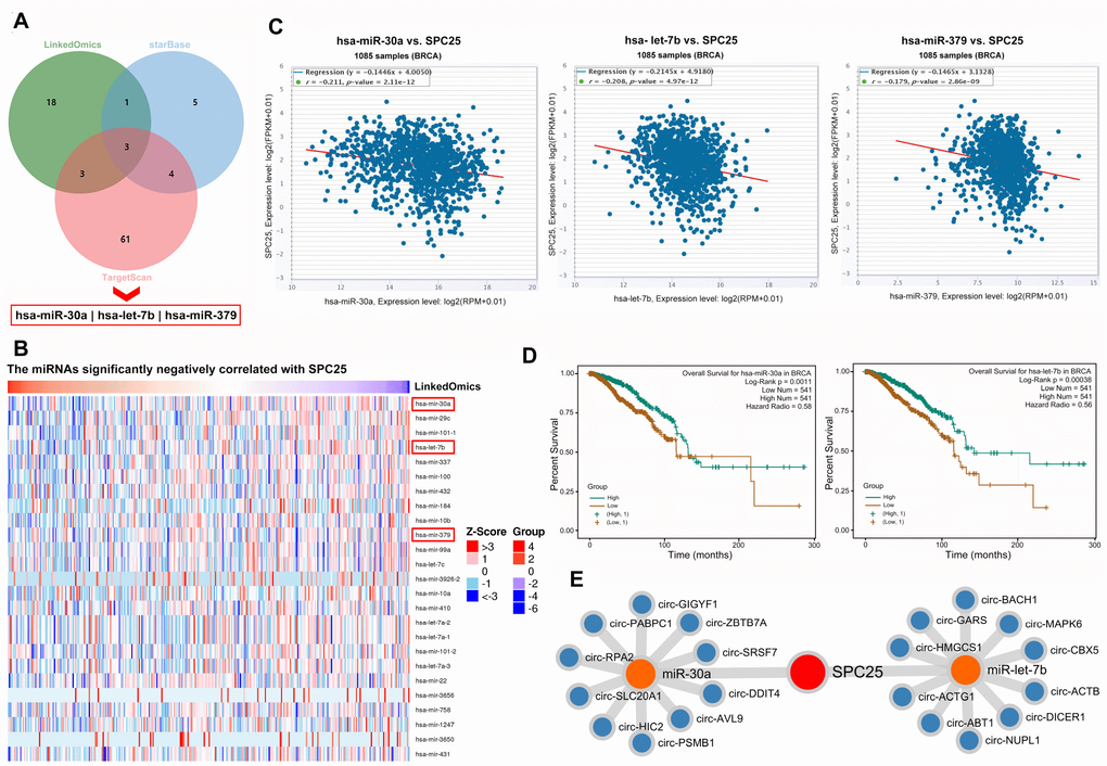 Examination of LinkedOmics, starBase, and Targetscan, revealed three common miRNAs that were downregulated in BC according to all three databases: hsa-miR-30a, hsa-let-7b, and hsa-miR-379 (Figure 5A, 5B). Further analysis in starBase indicated that the expression of all three miRNAs was negatively correlated with SPC25 expression in BC (Figure 5C). Most importantly, patients with higher expression of hsa-miR-30a or hsa-let-7b had shorter survival times (Figure 5D). Because circRNAs can further regulate gene expression by sponging miRNAs, the ten circRNAs most likely to sponge hsa-miR-30a and hsa-let-7b in BC were also identified (Figure 5E).