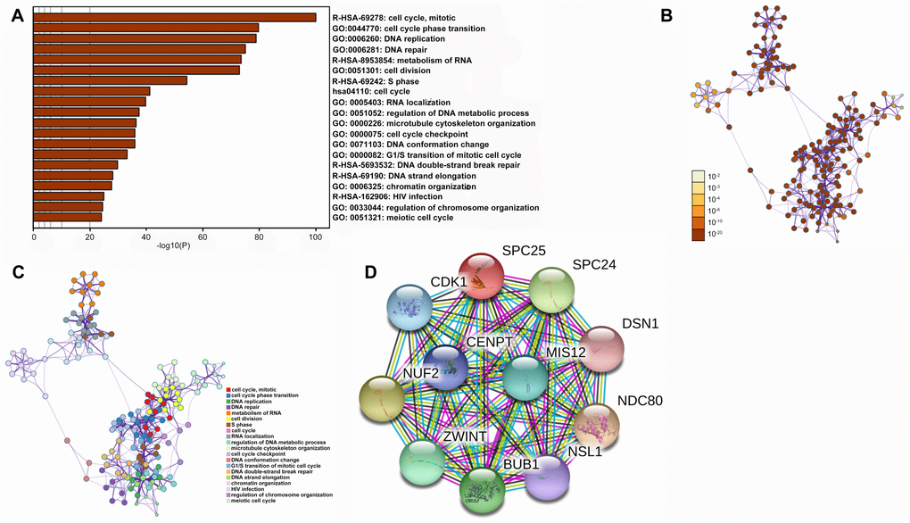 Enrichment analysis of co-expression genes performed using Metascape indicated that SPC25 is primarily involved cell cycle progression and DNA replication and repair processes (Figure 6A–6C), which is consistent with the single-cell analysis results. A STRING interactive network was used to identify proteins which can bind directly to SPC25 (Figure 6D).