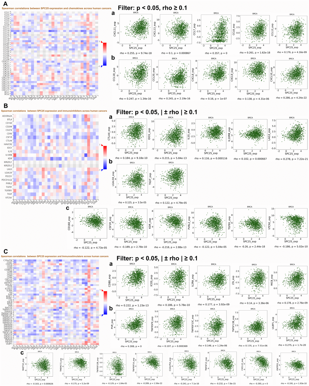 Interactions between tumors and immune cells are a growing subject of research, and many studies are currently evaluating the clinical value of immunomodulation in BC patients. Hammerl etal. suggested that the quantity and quality of tumor-infiltrating lymphocytes (TILs) differs among BC subtypes, as does the occurrence and antigenicity of immune evasion mechanisms [21]. All of these factors should therefore be evaluated when designing and selecting the best immunotherapy for specific BC patient subgroups. DISIDB results indicated that SPC25 expression was lowest in C3 (inflammatory) and highest in C2 (IFN-γ dominant) immune cell subtypes. More importantly, we identified associations between many chemokines and SPC25 expression in BC. For example, CCL7 (rho=0.357, p=0) is derived from cancer-associated fibroblasts (CAFs) in the interstitial microenvironment. Studies have shown that CCL7 promotes migration and invasion of cancer cells in a dose-dependent manner [22]. Knockdown of SPC25 inhibited the proliferation of BC cells, and SPC25 expression was positively correlated with CCL7. It is therefore possible that SPC25 is a downstream target of CCL7 and is partially responsible for CCL7-induced promotion of tumor cell proliferation. In addition, we found that some immunological checkpoints that have recently received increased attention, such as CXCL8, CTLA4, IDO1, and TIGIT, are positively correlated with SPC25 expression in BC. It is possible that these immune checkpoints are expressed at even higher levels in TNBC, in which SPC25 expression is also higher, than in other BC subtypes. Inhibitors targeting these immunological checkpoints might therefore be particularly effective in TNBC patients, especially in combination with SPC25 inhibitors such as OTSSP167. Furthermore, this higher SPC25 expression might explain the poorer prognosis and shorter survival times observed in TNBC patients. Finally, the immunostimulant CXCL12 is negatively correlated with SPC25; if SPC25 expression is an effective indicator of prognosis in BC, CXCL12 might also serve as a useful immunotherapy biomarker by reflecting the status of the immune microenvironment in BC patients.
