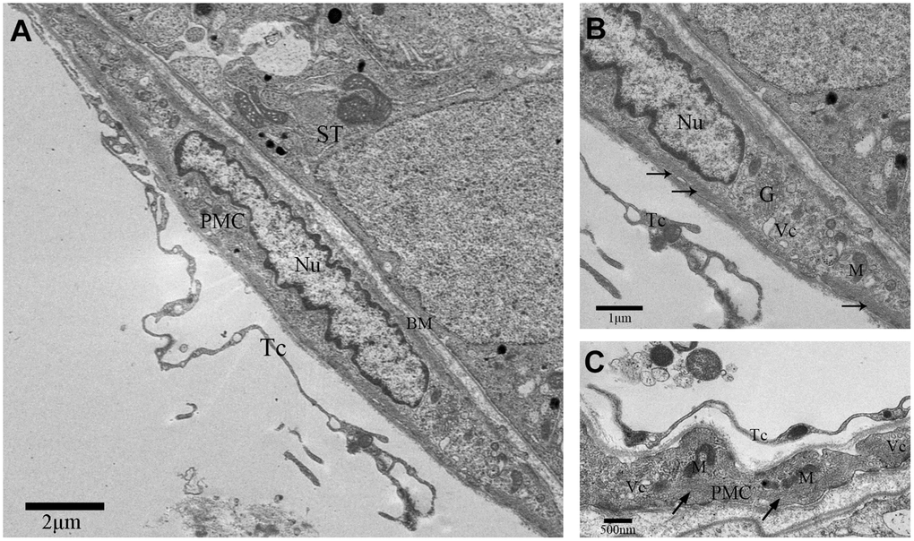 TEM images showed that PMC surround the seminiferous tubules (ST; Figure 1A). The PMC cells contained concertina-shaped nuclei, abundant actin filaments, mitochondria, Golgi apparatus and vesicles (Figure 1B–1C). We also observed a thin layer of cells on the outside of the PMC layer that showed long, thin, moniliform cytoplasmic prolongations (Figure 1A, 2A).
