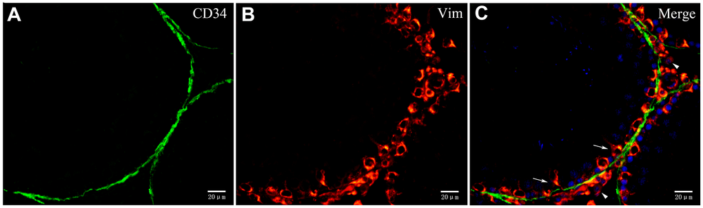 We also observed that the layer enclosing the ST was PDGFRα positive (Figure 9B). Double IF staining showed that the inside layer is PMC stained positive for α-SMA, and the outer layer is TCs stained positive for PDGFRα (Figure 9A-C). This confirmed the existence of TCs in the outer layer surrounding the ST. Furthermore, Leydig cells and Sertoli cells also expressed PDGFRα (Figure 9B). Double-staining for vimentin and CD34 showed that vimentin staining was negative in the layer of cells surrounding ST that were CD34 positive, but positive vimentin staining was observed in the Sertoli and Leydig cells (Figure 10A-C). This suggested that the rat testicular TCs were vimentin negative.