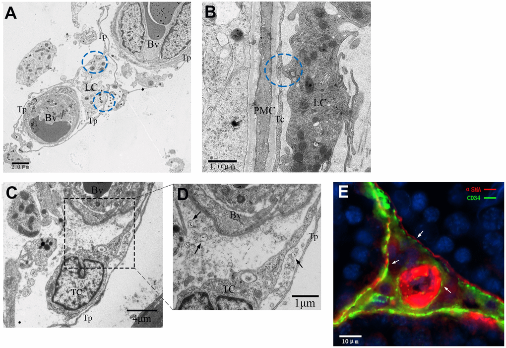 Furthermore, TCs were also observed in the intertubular stroma, which suggested that they formed an interactive network with other cells by spreading their processes to surround the entire capillary and the Leydig cells (Figure 11A, 11C). Numerous extracellular vesicles were detected between the telopodes and the vessel wall (Figure 11D). Moreover, TCs located in the outer layer of the PMC were in close membrane-to-membrane contact with the nearby Leydig cells via their telopodes (Figure 11B). These ultrastructural features were in accordance with the immunofluorescence data, which showed that CD34-positive cells established a network structure connecting the ST, blood vessels and the Leydig cells (Figure 11E).