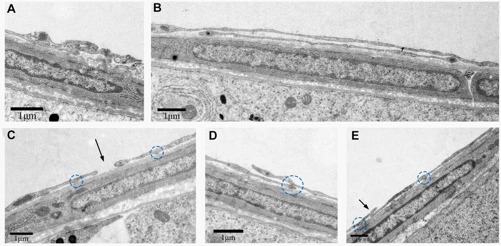 We further observed that these TCs were adjacent to each other. The telopodes (Tps) from neighboring cells were in physical contact with each other (Figure 5A). Several secretory vesicles were observed between the two Tps, suggesting home-cellular communication or exchange of intracellular material between the adjacent TCs through secretory vesicles (Figure 5B, 5C). As shown in Figure 6, various types of junctions were formed by Tps among the contiguous TCs, including the mortise and tenon joint (Figure 6A), punctiform structure (Figure 6B), short overlapped structure with punctate contact (Figure 6D, 6E), and closeness (Figure 6C). Based on these findings, we speculate that TCs surround the ST and communicate with each other through diverse intercellular connections.