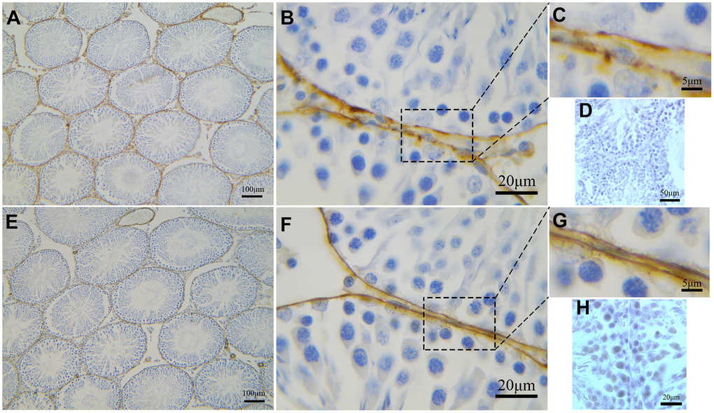 Low magnification images of IHC stained specimens show both CD34-positive and α-SMA-positive cells surrounding the entire ST (Figure 7A, 7E). However, at high magnification, positive CD34 staining shows distinct segmentation with the dilated parts showing strong CD34 positivity (Figure 7B, 7C). On the other hand, uniform positive α-SMA staining is observed throughout the smooth layer surrounding the ST (Figure 7F, 7G). Negative control group of rat tesits were also shown (Figure 7D, 7H).