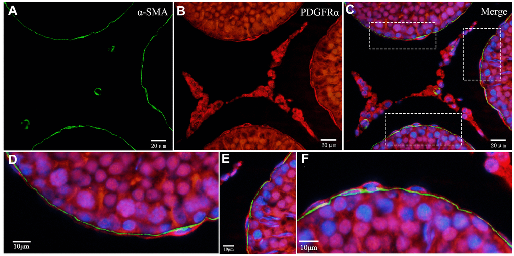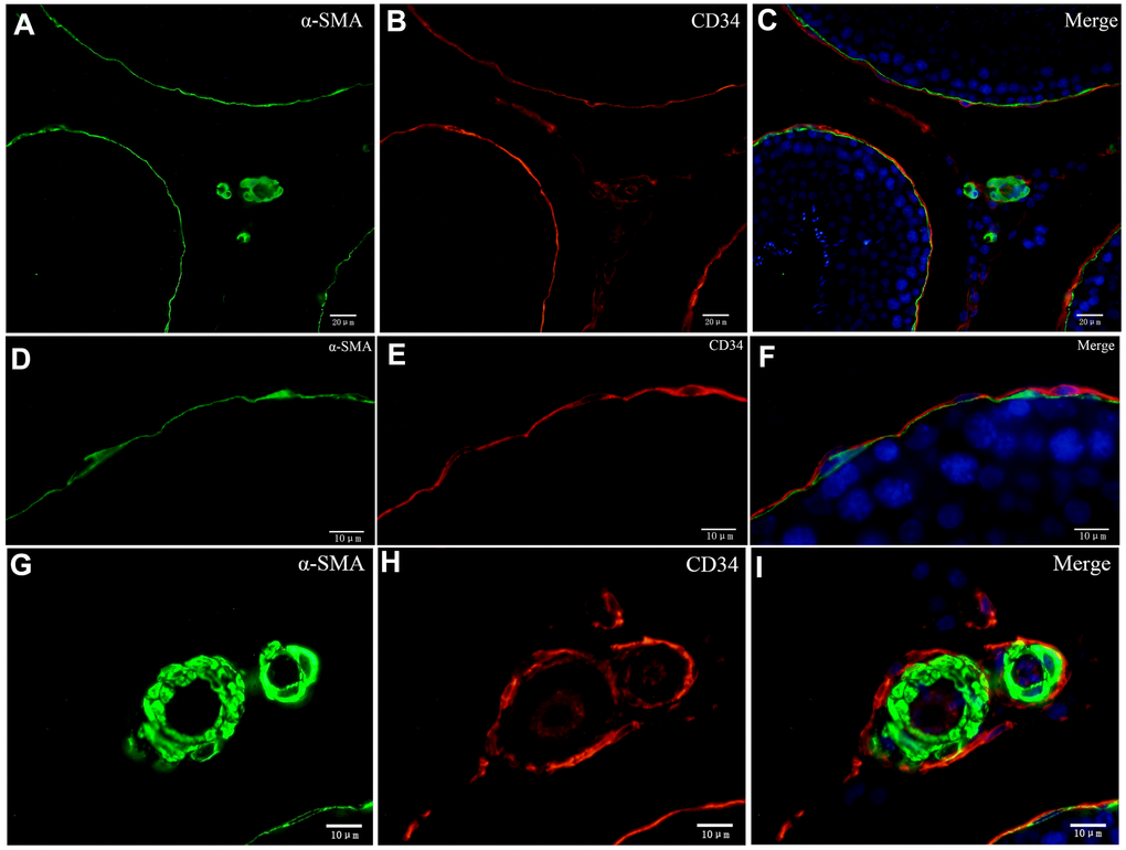 The rat testes tissue paraffin sections were deparaffinized followed by antigen unmasking in sodium citrate buffer. Then, the tissue sections were incubated with 1% bovine serum albumin (room temperature for 30 min) to block non-specific antibody binding. Following this, the samples were incubated at 4°C overnight with the following primary antibodies: rabbit anti-CD34 (1:100 dilution; catalog no. BA3414; Boster, Wuhan, China); rabbit anti-PDGFRα (1:100 dilution; catalog no. BA0275; Boster, Wuhan, China); mouse anti-vimentin (1:100 dilution; catalog no. BA0135; Boster, Wuhan, China); and mouse anti-αSMA (1:100 dilution; catalog no. BM0002; Boster, Wuhan, China). Then, after washing with 0.1M PBS (pH 7.4), samples were incubated with Alexa Fluor-488-conjugated goat anti-rabbit IgG (1:150 dilution; catalog no. RBaf48801; Fcmacs, Nanjing, China) and Tritc-conjugated goat anti-mouse IgG (1:150 dilution; catalog no. BA1089; Boster, Wuhan, China), Tritc-conjugated goat anti-Rabbit IgG (1:150 dilution; catalogno. BA1090; Boster, Wuhan, China) and Alexa Fluor-488conjugated goat anti-Mouse IgG (1:150 dilution; catalog no. BA1126; Boster, Wuhan, China) secondary antibodies for two hours at 37°C. Nuclei were counterstained with 4′,6-diamidino-2-phenylindole (DAPI) (catalog no. 13G04A76; Boster, Wuhan, China). After mounting with glycerin, sections were observed under an Olympus BX53 microscope and fluorescent images were captured with an Olympus DP73 digital color camera.