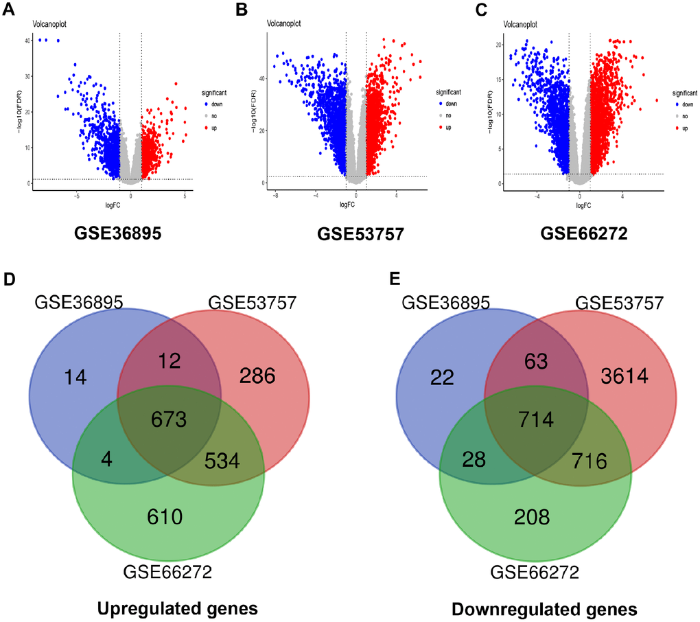 After data preprocessing and quality assessment, expression matrices of three expression profiles were obtained, including GSE36895, GSE53757 and GSE66272. Using |log2FC| > 1 and FDR < 0.05 as the threshold, all the differentially expressed genes were screened out in three expression profiles (Supplementary Tables 2–4). The DEGs of three datasets were shown as volcano plots in Figure 1A–1C. After being overlapped, the common 1387 genes were identified, including 673 upregulated and 714 downregulated genes (Figure 1D–1E).