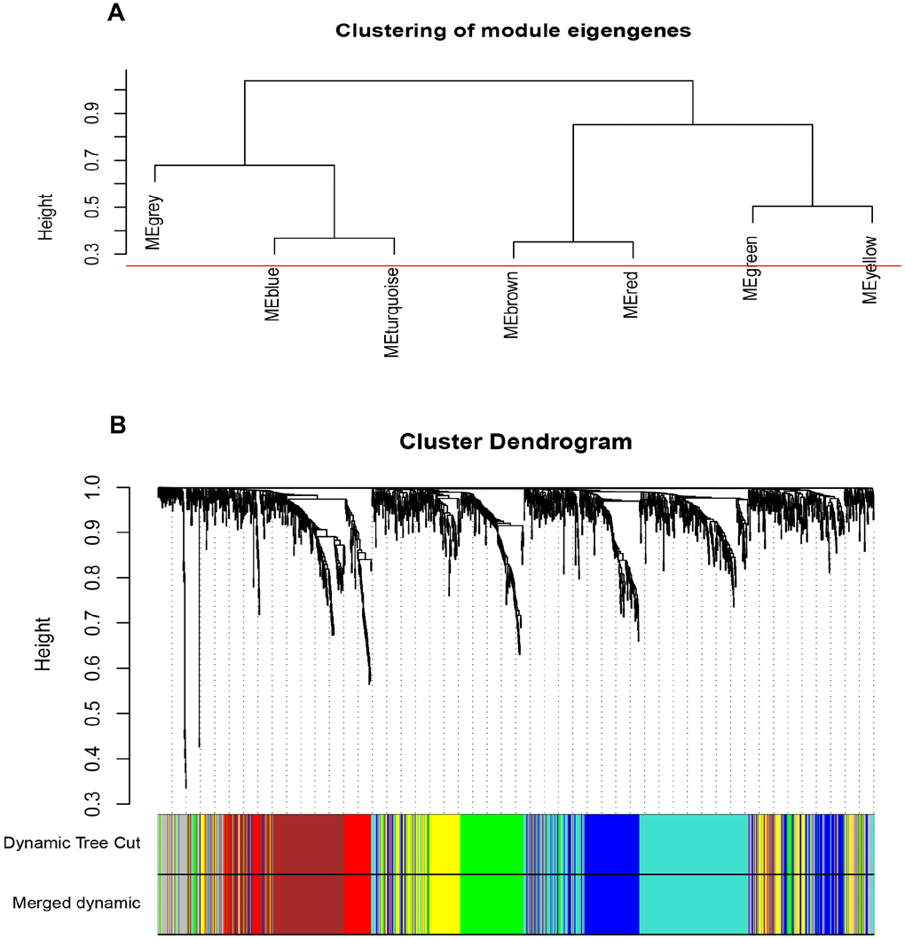 Weighted gene co-expression network were constructed by “WGCNA” R package, as previously described [38, 39]. First, sample clustering of common DEGs was performed to check if they were good genes and good samples. Second, a soft threshold power β was selected in accordance with standard scale-free networks. Third, we calculated the adjacencies between all filtered genes by the power adjacent function to Pearson correlation matrix to transform data into a topological overlap matrix (TOM), and the corresponding dissimilarity (1-TOM) was calculated. Then, According to the TOM-based dissimilarity measurement, average linkage hierarchical clustering was conducted with a minimum size of 50 for the genes dendrogram. To further analyze the module, the dissimilarity of module eigengenes was calculated. Highly similar modules were identified by clustering and then merged together with a height cut-off of 0.25.