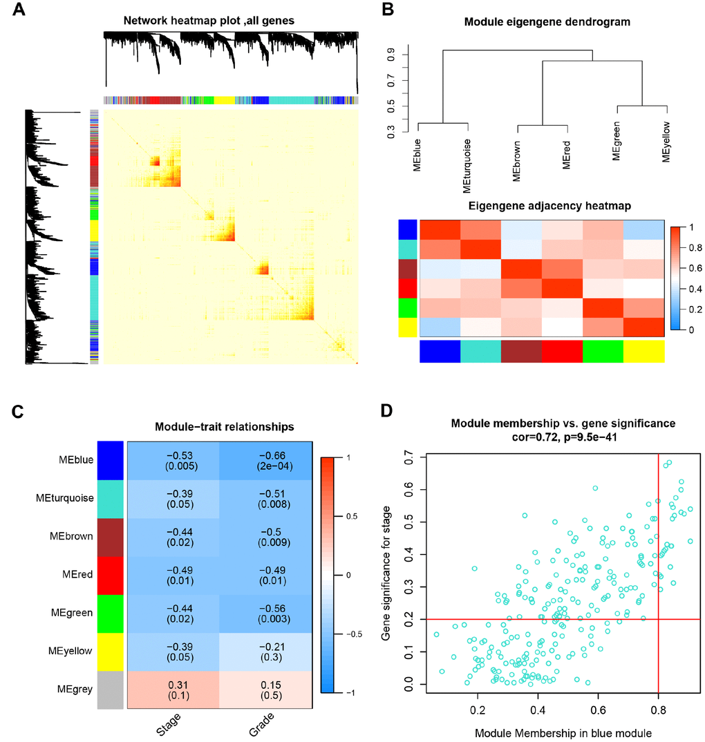 The network heatmap was performed to analyze the interaction relationship of 7 modules (Figure 3A). The results showed that each module was independent of each other, which indicated a high-scale independence degree among these modules and distinct independence of genes expression in each module. Then we calculated eigengenes of all modules and clustered them based on their correlation. Module eigengene dendrogram showed that the 6 modules were mainly divided into two clusters, and eigengene network heatmap demonstrated similar results (Figure 3B). Furthermore, the ME of the blue module showed the blue module was significantly associated with ccRCC tumor stage and grade compared with other modules (Figure 3C). Therefore, we selected the blue module for subsequent analysis, and identify the relevance between blue module and the clinical features with great biological significance (Supplementary Table 5).