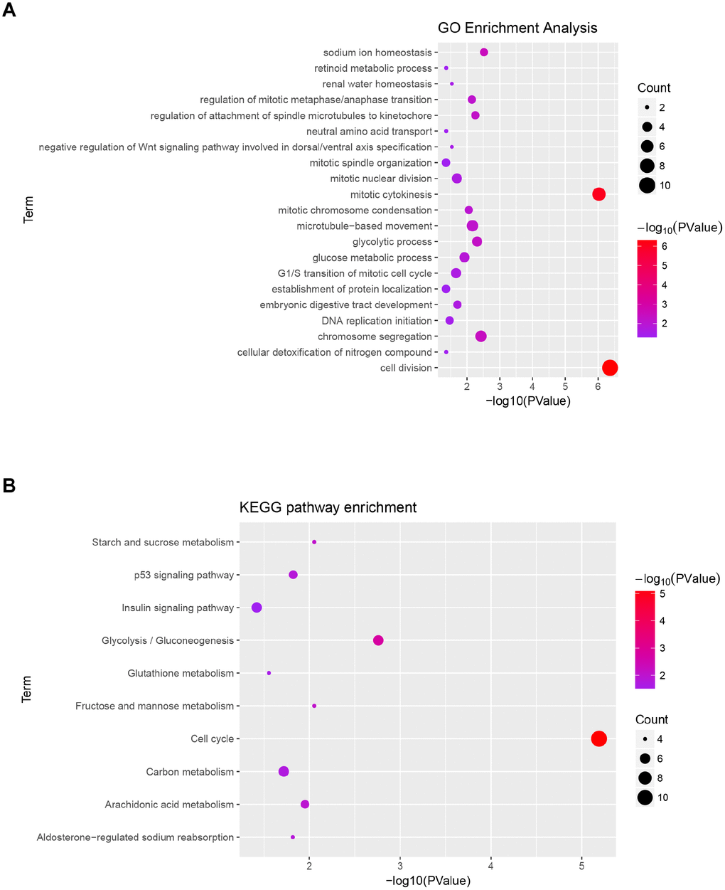 Gene ontology analysis and KEGG pathway enrichment were performed for the above blue module to explore potential biological processes associated with ccRCC. Biological process of gene ontology analysis showed genes in the blue module were mainly associated with cell division, cell proliferation, cell cycle and metabolic related pathway (Figure 4A). The result of KEGG pathway enrichment was showed in Figure 4B. The most significant pathway was cell cycle, the other significant pathways included glycolysis/gluconeogenesis, fructose and mannose metabolism, starch and sucrose metabolism, arachidonic acid metabolism, p53 signaling pathway, aldosterone-regulated sodium reabsorption, carbon metabolism, glutathione metabolism and insulin signaling pathway.