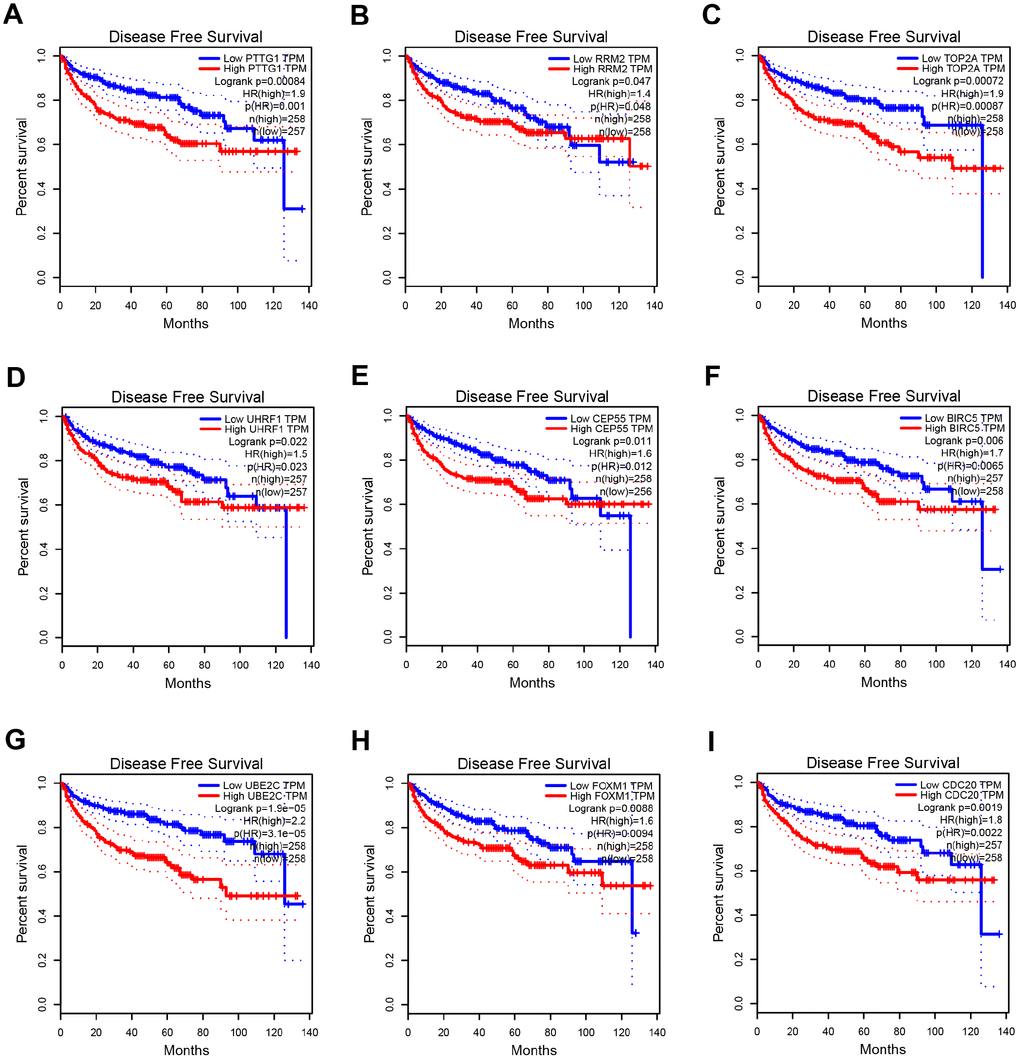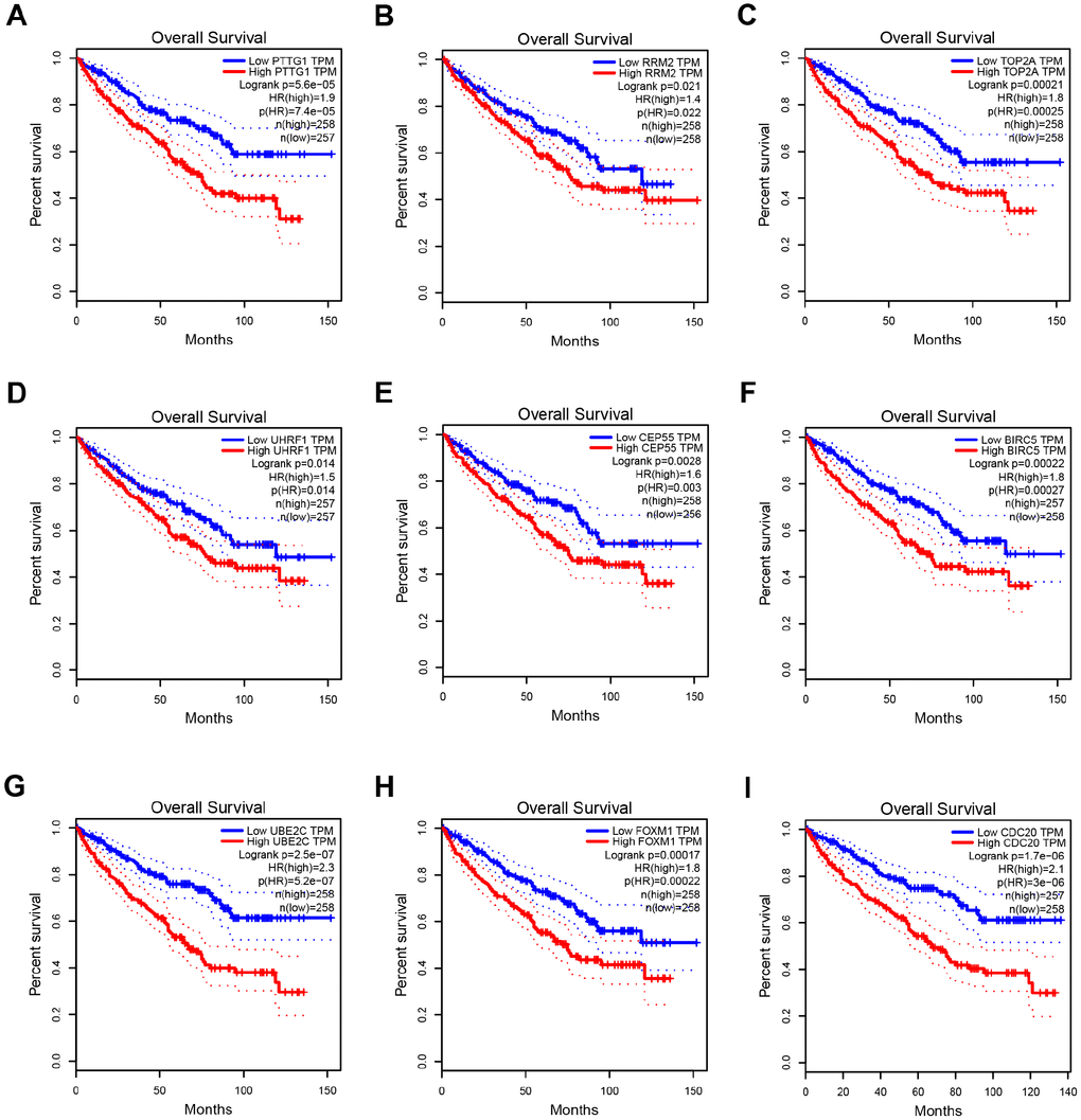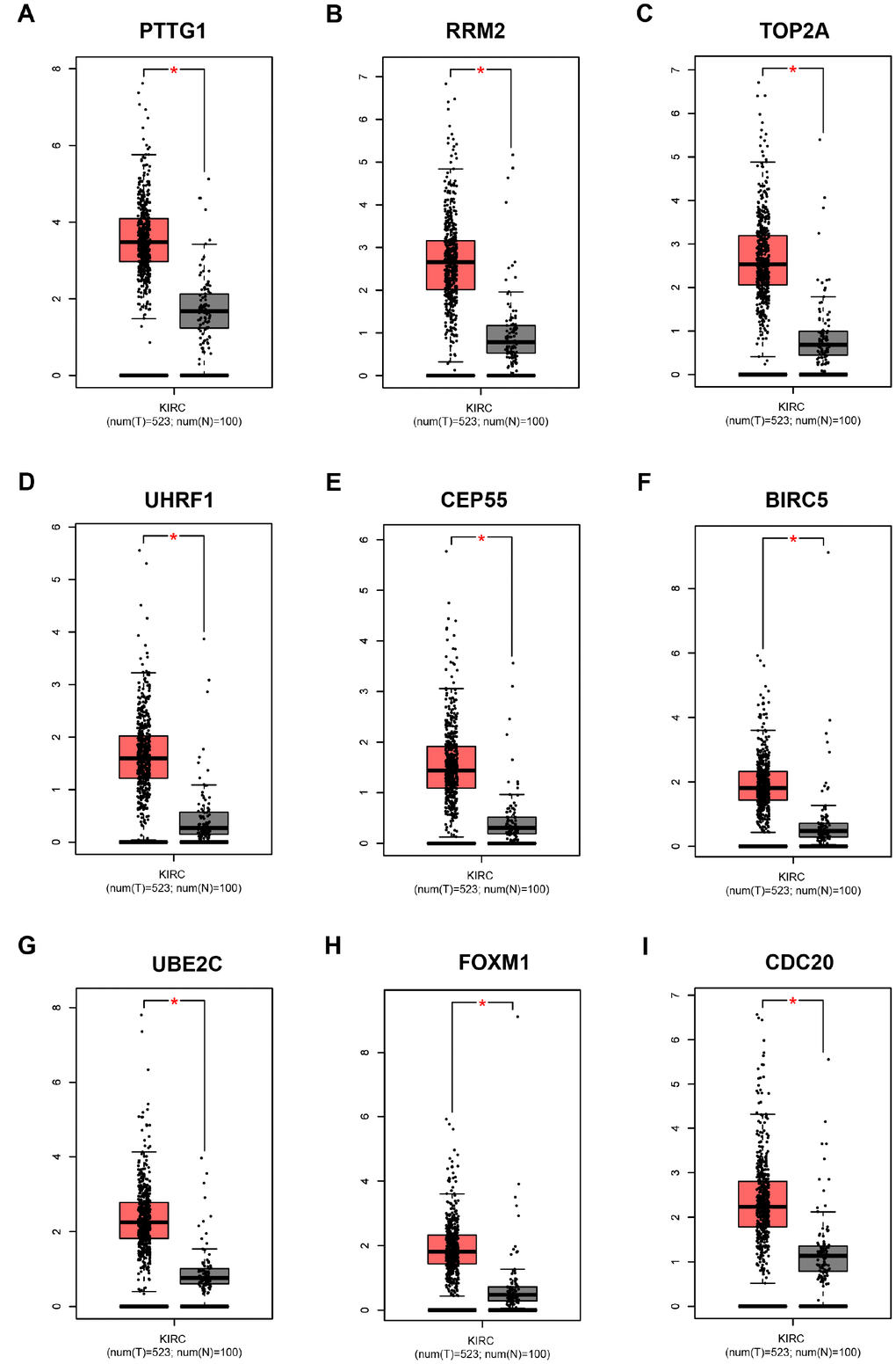 The 9 key genes consist of BIRC5, CDC20, CEP55, FOXM1, PTTG1, RRM2, TOP2A, UBE2C and UHRF1. They were all oncogenes, and associated with progression and prognosis of ccRCC patients. Few of them were identified as biomarkers in clear cell renal cell carcinoma. BIRC5 (survivin) is a member of the IAPs family. It can suppress apoptosis and regulate cell proliferation. BIRC5 overexpression has been reported in various malignancies, and it was a prognostic marker in renal cell carcinoma [5–7]. Two meta-analysis suggested that high survivin expression was associated with poor prognosis and more advanced pathological stage, and it could be used as a biomarker for disease management [8, 9]. CDC20 is one of the cell cycle related proteins. It was high expressed in most malignant tumor tissues and played an oncogenic role in tumorigenesis and tumor progression. Wu et al. reported that CDC20 expression was an independent prognostic factor in colorectal cancer and can serve as a potential prognostic biomarker [10]. Gao et al. also found that the growth and invasion of osteosarcoma cells was restrained by inhibiting CDC20 expression [11]. CEP55 is a member of the coiled-coil protein family, its main function is to anchor microtubule-associated proteins, participate in spindle formation, and regulate cell proliferation [12]. CEP55 is expressed in normal tissues and tumor cells, and is coupled with centrosomes and intermediates in the cell cycle, and plays a role in regulating cell cycle after phosphorylation. It has been found that CEP55 overexpression is significantly associated with tumor stage, invasiveness, and tumor metastasis of many malignant tumors [13–15]. FOXM1 is a transcription factor. It plays an important role in the regulation of multiple biological processes, including cell proliferation, cell cycle progression, cell differentiation, DNA damage Repair, tissue homeostasis, angiogenesis and apoptosis. Some research results indicated that FOXM1 plays a major role in tumorigenesis, Tan et al. found that FOXM1 was a specific marker in triple-negative breast cancer [16]. Breyer et al. identified that FOXM1 expression was associated with advanced clinical and pathological feature in bladder cancer [17]. PTTG1 is an oncogene which is closely associated to cell proliferation, differentiation and various signal transduction pathways. PTTG1 can directly induce carcinogenesis by cell transformation, activating proto-oncogenes and growth factors [18]. RRM2 is a key enzyme in DNA synthesis and repair pathways, and high expression of RRM2 is relative to tumor angiogenesis, invasion and metastasis [19, 20]. Previous literature reported that RRM2 promoted tumorigenesis and progression of pancreatic cancer, lung cancer, gastric cancer, ovarian cancer, bladder cancer and other tumors [21–24], TOP2A gene encoded a DNA topoisomerase, it is an ATP-dependent synthetase and hydrolase that plays a key role in cells and plays an important role in many cellular biological processes, such as DNA replication, chromatin condensation, chromosome segregation, and chromosome structure retention. Studies have found that high expression of TOP2A promoted the progression of breast cancer [25, 26]. UBE2C is also known as UbcH10, which is a member of the ubiquitin-coupled enzyme E2 family. It has been reported that the expression level of UBE2C is positively correlated with tumor grade and poor prognosis in the adrenal cancer, breast cancer, colon cancer, lung cancer and ovarian cancer [27–31]. UHRF1 is a newly discovered oncogene which related to cell growth. As a an important epigenetic regulator, it plays an important role in the maintenance of DNA methylation, and participates in important biological processes such as cell proliferation, cell cycle regulation, apoptosis and radiosensitivity, regulating cell cycle G1-S phase and G2-M phase transition, thereby promoting tumor progression [32].
