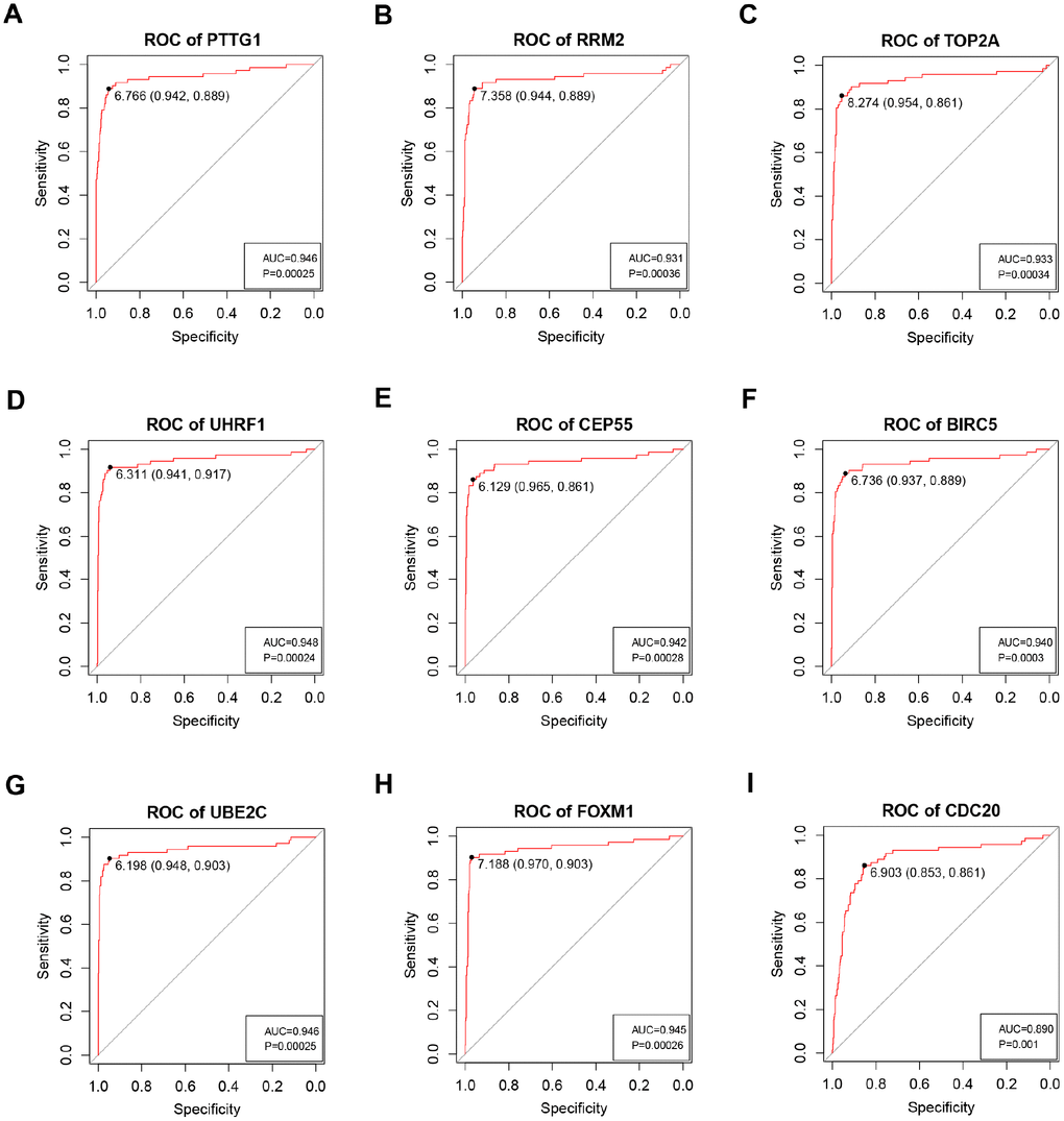 Based on the criteria that cor.geneModuleMembership > 0.8 and cor.geneTraitSignificance > 0.2, 25 genes with the high connectivity in blue module were screened as hub genes (Figure 3D). Then 25 hub genes were validated using ccRCC data of GEPIA database. Among them, PTTG1, RRM2, TOP2A, UHRF1, CEP55, BIRC5, UBE2C, FOXM1 and CDC20 were negatively associated with the overall survival and disease free survival of ccRCC patients (Figures 5, 6). Moreover, based on the GEPIA database and Oncomine database, the expression levels of these 9 genes were significantly higher in ccRCC tumor tissues, compared with paracancerous normal tissues (Figure 7 and Supplementary Figure 3). In addition, based on individual cancer stage analysis, the expression of these 9 genes were significantly upregulated in the advanced tumor stages (Supplementary Figure 4). The protein expression levels of these 9 genes were significantly higher in tumor tissues compared with paracancerous normal tissues based on the Human Protein Atlas database (Supplementary Figure 5). A ROC curve was generated to verify the diagnostic performance of these 9 genes based on the TCGA database. The AUC showed that PTTG1, RRM2, TOP2A, UHRF1, CEP55, BIRC5, UBE2C, FOXM1 and CDC20 indicated excellent diagnostic efficiency for tumor and normal tissues (Figure 8). To further assess whether it can provide the favorable prognostic value based on these 9 gene expression levels, the multivariate Cox regression analysis was performed. The results in Table 1 showed that the risk score base on these 9 genes signature was a clinically independent prognostic factor for ccRCC patients.