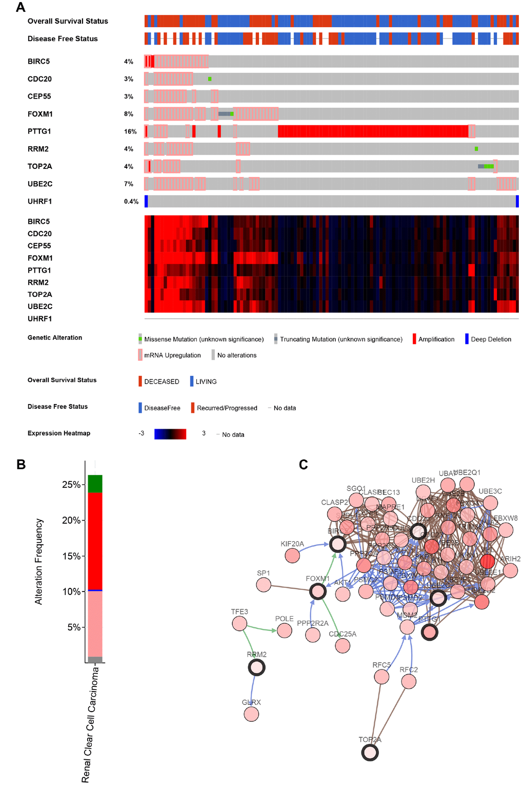 The alteration statuses of 9 key genes were analyzed using TCGA ccRCC patients’ data of cBioPortal database. The 9 hub genes altered in 118 (26%) of 446 ccRCC patients (Figure 9B), and the frequency of alteration of each hub gene was shown in Figure 9A. PTTG1 and FOXM1 altered most (16% and 8%, respectively), amplification and mRNA upregulation were the main type. Figure 9C showed the relationship of the 9 genes and the other 50 most frequently altered neighbor genes. FOXM1, BIRC5, CDC20 and UBE2C were significantly important in the network.