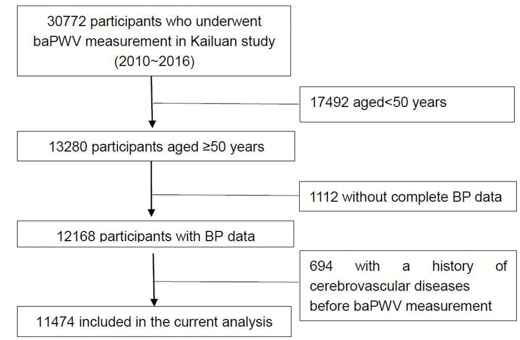 To capture a distinct sample of individuals with HVA, in the present study we considered only participants in late middle age or older (aged ≥ 50 years), and we only enrolled participants who underwent baPWV measurement between 2010 and 2016. We excluded participants for whom blood pressure data was lacking as well as those with a history of cerebrovascular diseases before the baPWV measurement.