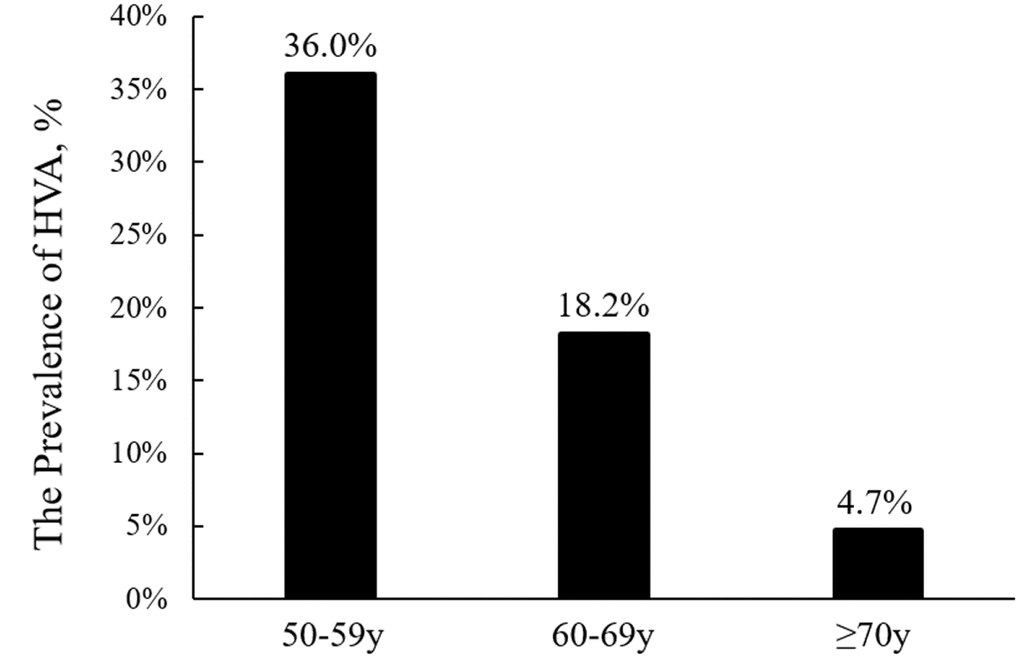 The prevalence of HVA was 36.0% among participants aged 50 to 59 years, 18.2% among participants aged 60 to 69 years, and 4.7% among those aged ≥70 years (Figure 2). Using a multivariable analysis, we found that younger age, female sex, lower body mass index (BMI), lower high-sensitive C-reactive protein (hs-CRP), lower fasting blood glucose (FBG), higher education level, active physical activity, absence of current alcohol drinking, and the absence of diabetes mellitus and hyperlipidemia were significantly associated with HVA (p<0.05) (Table 2).