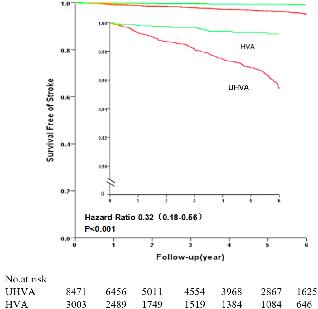 In conclusion, it appears that HVA may have reduced the risk of first stroke in a community-based Chinese cohort. This suggests that evaluation of vascular aging as part of public health screening may be useful for stroke risk assessment and for stroke prevention.