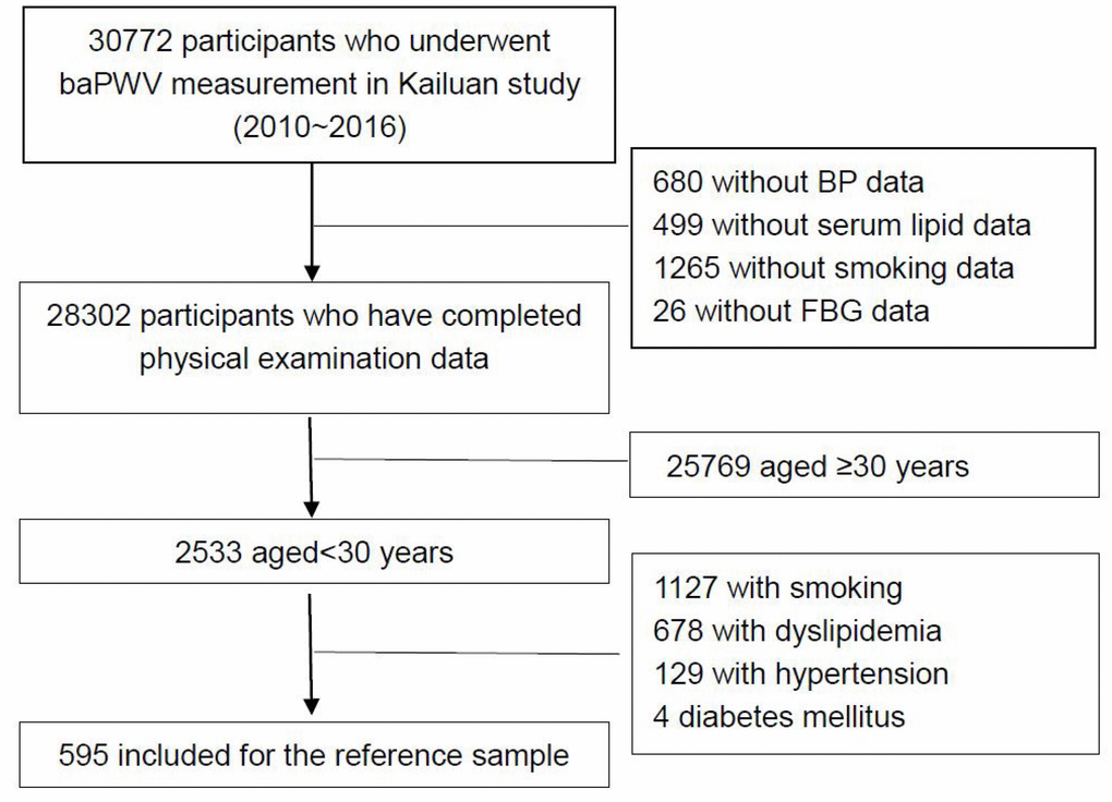 We defined HVA for participants aged ≥ 50 years as follows [12]: 1) absence of hypertension, which was defined as a systolic blood pressure < 140 mmHg, a diastolic blood pressure < 90 mmHg (blood pressure was measured at least twice at different occasions), and an absence of antihypertensive drugs; 2) baPWV < mean + 2 standard deviations (SD), which was determined from a reference sample of healthy participants aged 18-30 years with no cardiovascular risk factors (e.g., hypertension, diabetes, smoking, hyperlipidemia) and without a history of myocardial infarction, stroke, and other cardiovascular disease. To obtain the reference value for baPWV, we enrolled 595 healthy participants aged < 30 years from the Kailuan study (Figure 4). The results showed that the reference value for baPWV was 11.90 ± 1.65 m/s. Thus, HVA was defined as a normotensive blood pressure and baPWV < 15.20 m/s. Based on these data, participants were classified into HVA and Non-HVA groups.