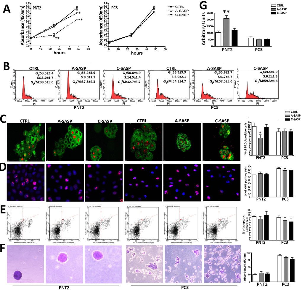 The proliferation assay evidenced that the A-SASP was effective in reducing proliferation in PNT2 but not in PC3 cells (Figure 1A). The C-SASP decreased PNT2 cell proliferation even though to a lesser extent if compared to the A-SASP. The C-SASP was ineffective on PC3 cell proliferation (Figure 1A). A cell cycle analysis of PNT2 cells evidenced that only the A-SASP was able to reduce the number of S-phase cells (Figure 1B). The cell cycle profile of PC3 was unaffected by both SASPs (Figure 1B). Data of cells in S phase was confirmed with BrdU immunostaning. We performed a two hours pulse of PNT2 and PC3 cells with BrdU and then determined the percentage of positive cells in the different experimental conditions. A-SASP reduced the percentage PNT2 cells in S-phase cells compared with controls (7.7% ± 0.9% vs 12% ± 1.2%) while C-SASP was ineffective (12.7% ± 1.9% vs 12% ± 1.2%) (Figure 1C). We detected 9.8% BrdU(+) PC3 cells in control cultures and this percentage was not significantly affected by treatment with SASPs (Figure 1C). The percentage of Ki67(+) cycling cells was not influenced by SASP treatments (Figure 1D). Both the A- and C-SASP did not modify the apoptosis levels in PNT2 and PC3 cells (Figure 1E). Of interest, A-SASP induced senescence in PNT2 cells while it did not affect PC3 cells (Figure 1G). Tumorigenicity of both PNT2 and PC3 cells was not modified by SASP treatment as evidenced by the soft-agar assay (Figure 1F).