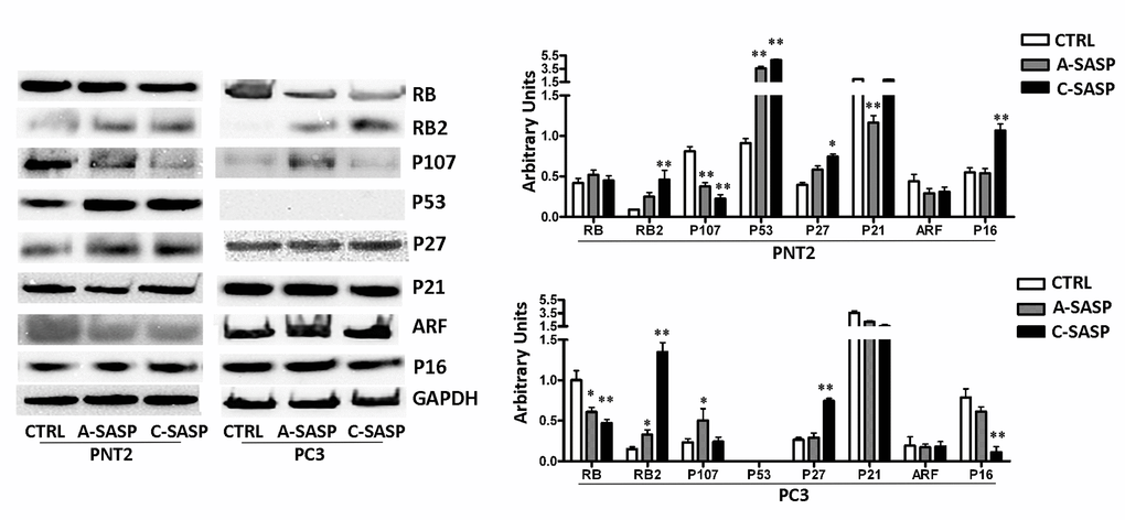 Also, the treatment of PC3 with SASPs promoted changes in the expression of the proteins involved in the control of cell proliferation, cell death, and senescence. In detail, in cells treated with the A-SASP, we observed a decrease of RB1 and an augmentation of P107 and RB2/P130. These changes appear at odds since P107 is mainly expressed in cycling cells while RB2/P130 is upregulated in quiescent/senescent cells [17] (Figure 2). Similar contrasting expression profiles were observed in PC3 incubated with the C-SASP (Figure 2).