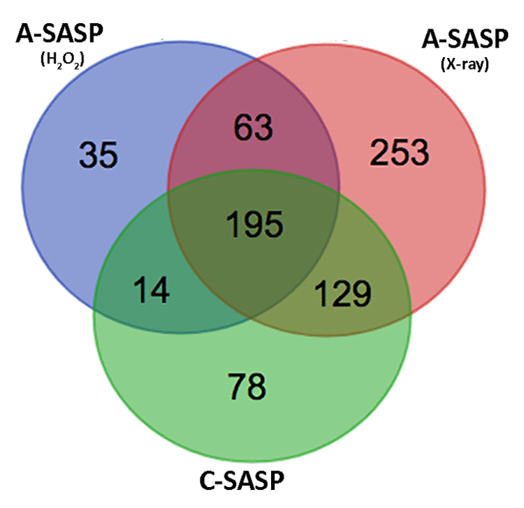 We used a Venn diagram (http://bioinformatics.psb.ugent.be/webtools/Venn/) to combine the data of all experimental conditions in order to find the proteins present, specifically in A-SASPs and not in C-SASPs. The A-SASP-specific proteins were analyzed with Panther (http://www.pantherdb.org) and DAVID software (https://david.ncifcrf.gov).