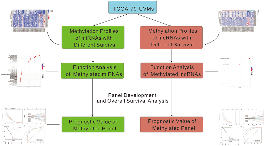 Some previous studies found that DNA methylation of some protein-encoding genes has been proved to be associated with the development, progression, and metastasis of UVMs [29]. However, little is known about the regulatory mechanisms of miRNAs and lncRNAs regulation by DNA methylation in UVMs, which has been proved to be crucial mechanisms in many other cancers. In this study, we developed methylated panels of miRNAs and lncRNAs, data from 79 UVMs patients. Bioinformatic functional analysis and prognostic value of differentially methylated miRNAs and lncRNAs were also performed Figure 1.
