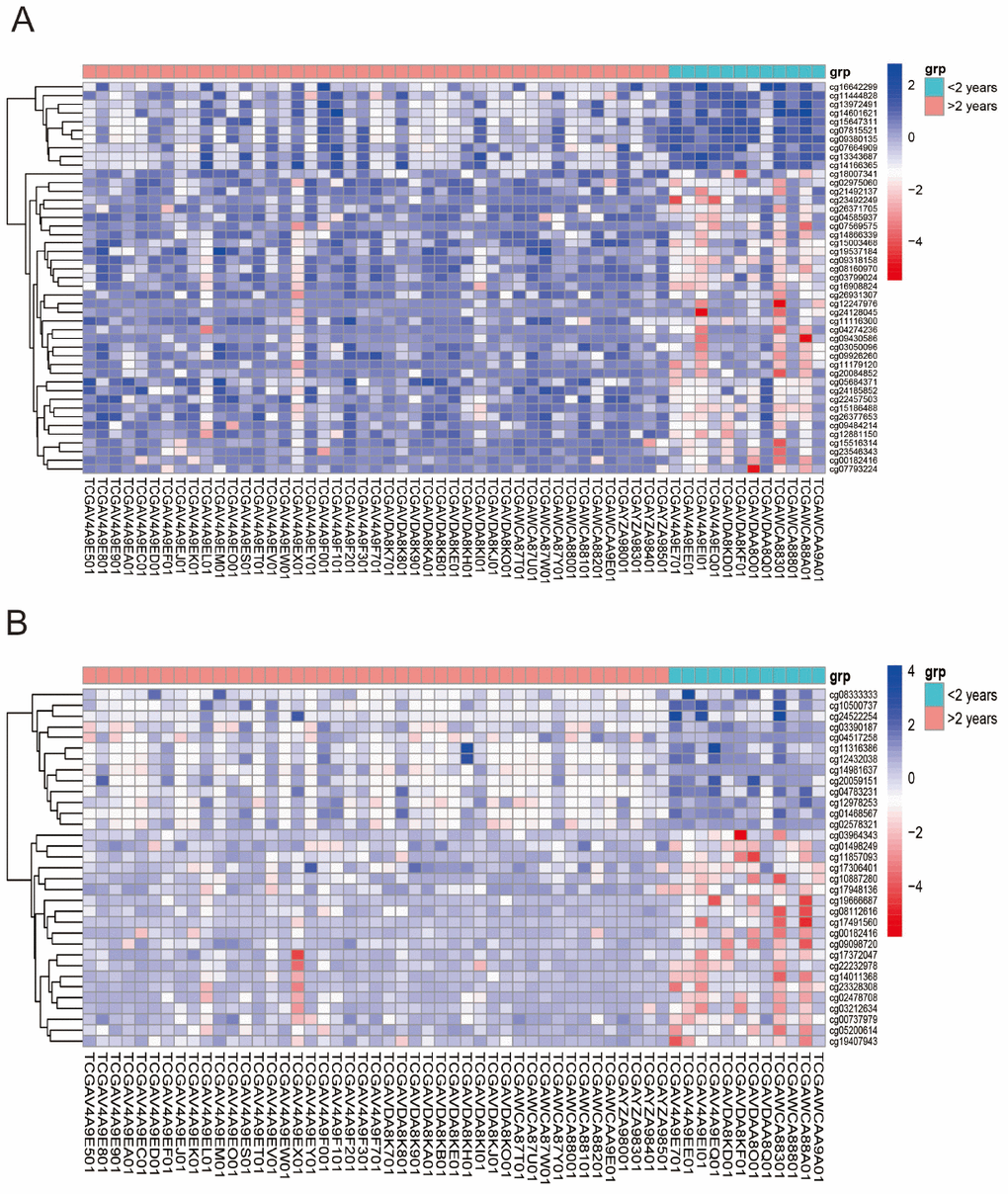 The DNA methylation profiles of 45 alive > 2 years and 12 alive < 2 years UVM patients were analyzed for determining methylated sites of miRNAs and lncRNAs. CpG sites in 2kb upstream of transcriptional start site (TSS) of miRNA or lncRNA were selected from 485577 sites from 450k Chip. We employed the "minfi" package to analyze methylation data by R software for differential methylated sites. Differentially methylated sites of miRNAs or lncRNAs between Alive < 2 years group and Alive > 2 years group were determined by calculating an exact beta-value. Hierarchical clustering (HC) analysis was performed with the R software with “pheatmap” package.