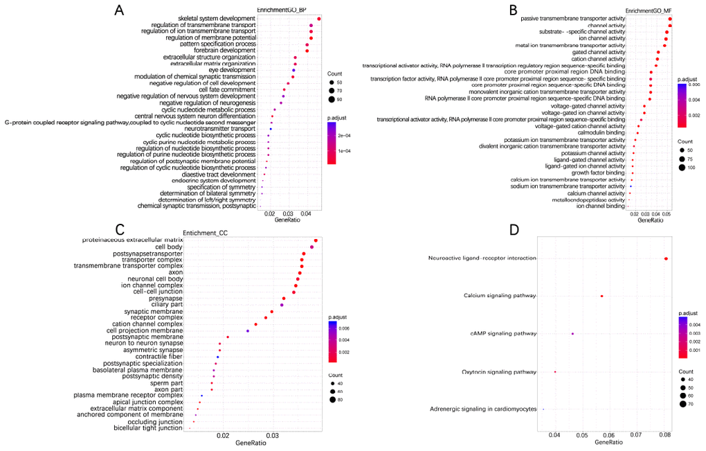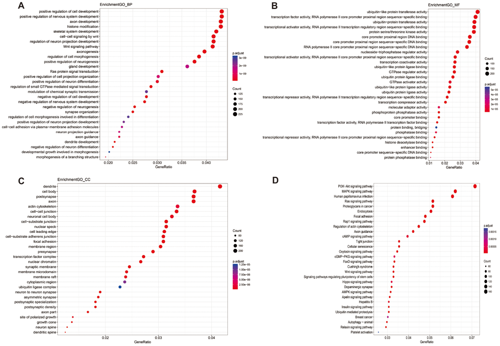 According to the annotation of 450k Chip by TCGA, 4160 CpG sites of miRNA and 11479 CpG sites of lncRNA were screened out. There were 55 CpG sites of miRNA and 47 CpG sites of lncRNA with differential methylation between UVM patients after diagnosis Alive < 2 years group and Alive > 2 years group, within which 45 CpG sites of miRNA and 33 CpG sites of lncRNA had the difference beta-values were greater than 0.1. Hierarchical clustering (HC) analysis of 57 tissues from UVMs with different survival time with different CpG sites of miRNAs and lncRNAs was performed (Figure 2). To identify the biological processes or pathways potentially regulated by differentially methylated miRNA target genes, we applied the miRNA target prediction algorithm and functional annotation analysis. A total of 6109 predicted target genes were identified, and the results showed that GO terms were enriched significantly, which are mainly related to positive regulation of cell development and signaling pathway (biological process, BP), and transcription regulator activity, protein kinase activity and DNA binding (molecular function, MF), and dendrite, cell body, synapse and axon (cellular component, CC). Significantly enriched pathway included the PI3K-Akt signaling pathway, and mitogen-activated protein kinase (MAPK) signaling pathway (Figure 3). In order to explore the potential functions of the differentially methylated genes co-expressed with the lncRNAs, a total of 4012 predicted co-expressed genes were identified using MEM analysis. The results showed that GO terms were enriched significantly, which are related to sequence-specific DNA binding, regulation of ion transmembrane transport, cell junction, multicellular organism development, chemical synaptic transmission and integral component of the plasma membrane. The significantly enriched pathway includes Neuroactive ligand-receptor interaction, cAMP signaling pathway and calcium signaling pathway (Figure 4). We also predicted the interaction of lncRNA signature with miRNA signature and found some gene symbols of lncRNAs interacted with one or more than one gene symbols of miRNAs (Supplementary Table 1). For instance, lncRNA gene symbol MEG8 was predicted to have interaction with miRNA gene symbol miR-379, and lncRNA gene symbol TUNAR was predicted to have interaction with miRNA gene symbol miR-5193 and miR-6754.