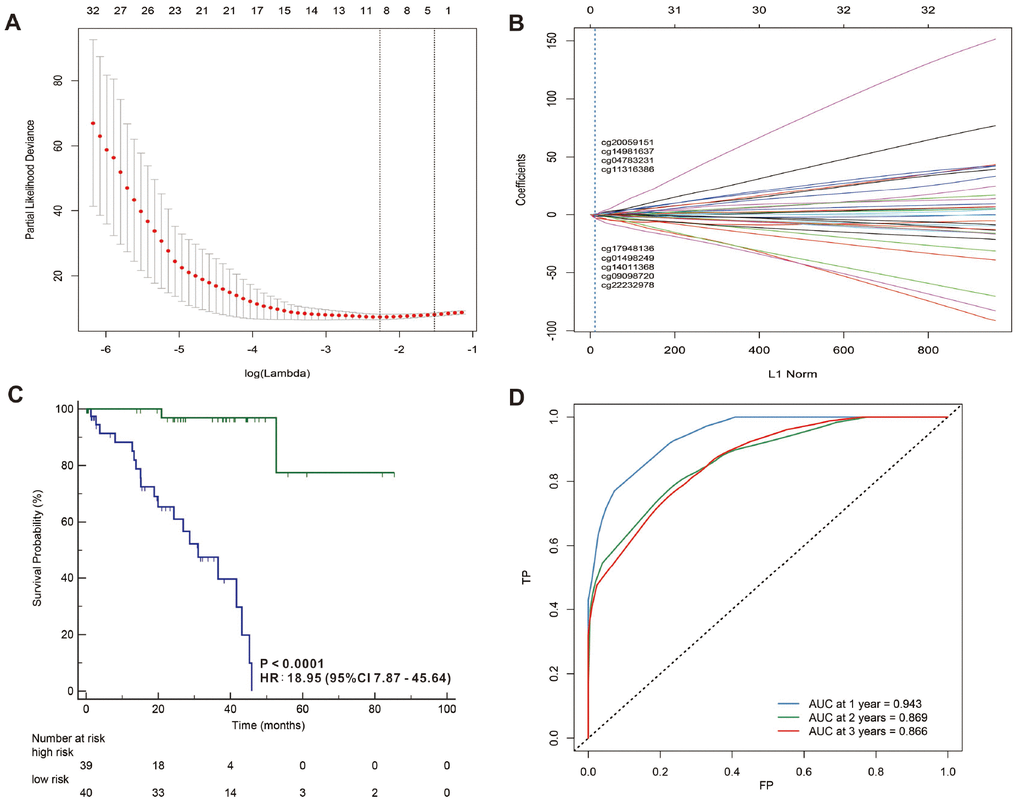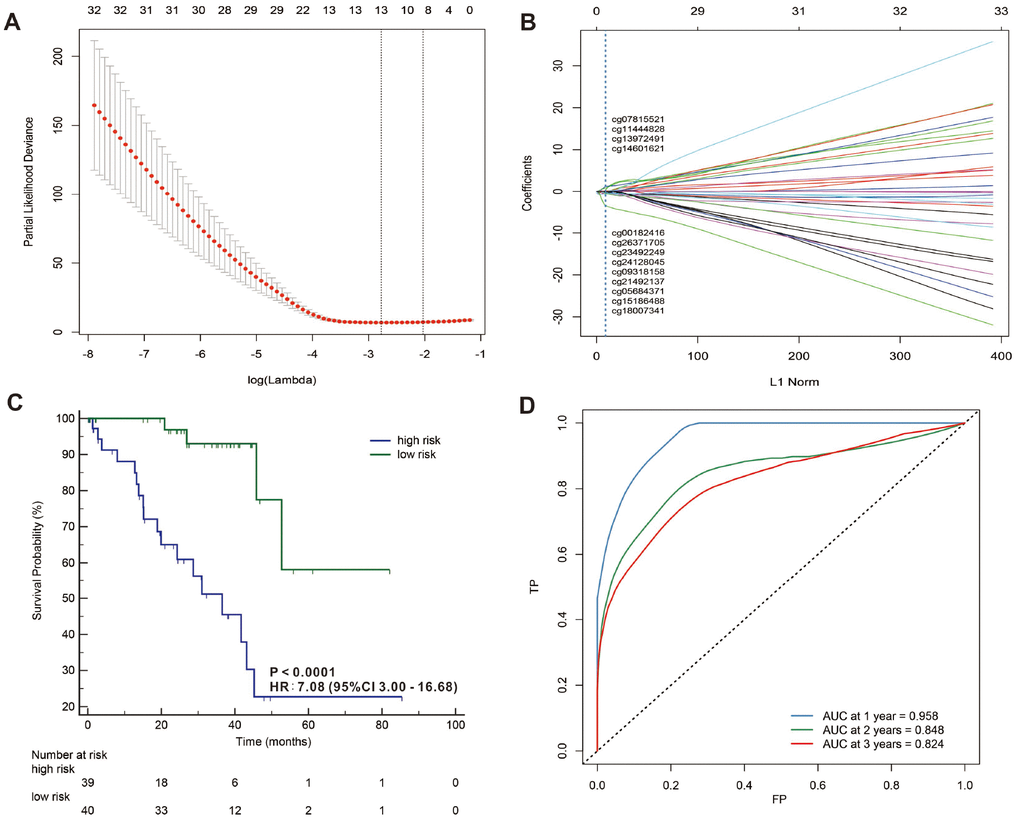 We used a least absolute shrinkage and selection operator (LASSO) Cox regression model to select the most meaningful predictive CpGs and build methylation-based classifiers using the sum of methylation levels of the selected CpGs weighted by the coefficients to predict mortality. A risk score for each patient was calculated based on their individual methylated levels of the CpG sites. Using the median of the risk scores, patients were divided into high-risk and low-risk groups. Kaplan-Meier method was used to estimate the survival probability. Time-dependent receiver operating characteristic (tdROC) analysis was used for assessing the prognostic accuracy of the classifiers.