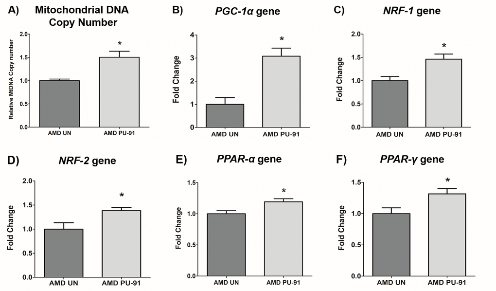 Accordingly, PU-91 significantly increased relative mtDNA copy numbers by 50% (p=0.03; AMD UN: 1 ± 0.03, n=4; AMD PU-91: 1.50 ± 0.13, n=4) (Figure 1A) and upregulated the gene expression of PGC-1α by 208% (p= 0.016; AMD UN: 1 ± 0.29, n=5; AMD PU-91: 3.08 ± 0.35, n=5) (Figure 1B), NRF-1 by 46% (p= 0.03; AMD UN: 1 ± 0.09, n=4; AMD PU-91: 1.46 ± 0.1, n=4) (Figure 1C), NRF-2 by 38% (p= 0.03; AMD UN: 1 ± 0.13, n=5; AMD PU-91: 1.38 ± 0.06, n=5) (Figure 1D), PPAR-α by 19% (p= 0.03; AMD UN: 1 ± 0.05, n=5; AMD PU-91: 1.19 ± 0.05, n=5) (Figure 1E), and PPAR-γ by 32% (p= 0.03; AMD UN: 1 ± 0.09, n=5; AMD PU-91: 1.32 ± 0.08, n=5) (Figure 1F) in AMD cybrids compared to their untreated counterparts.