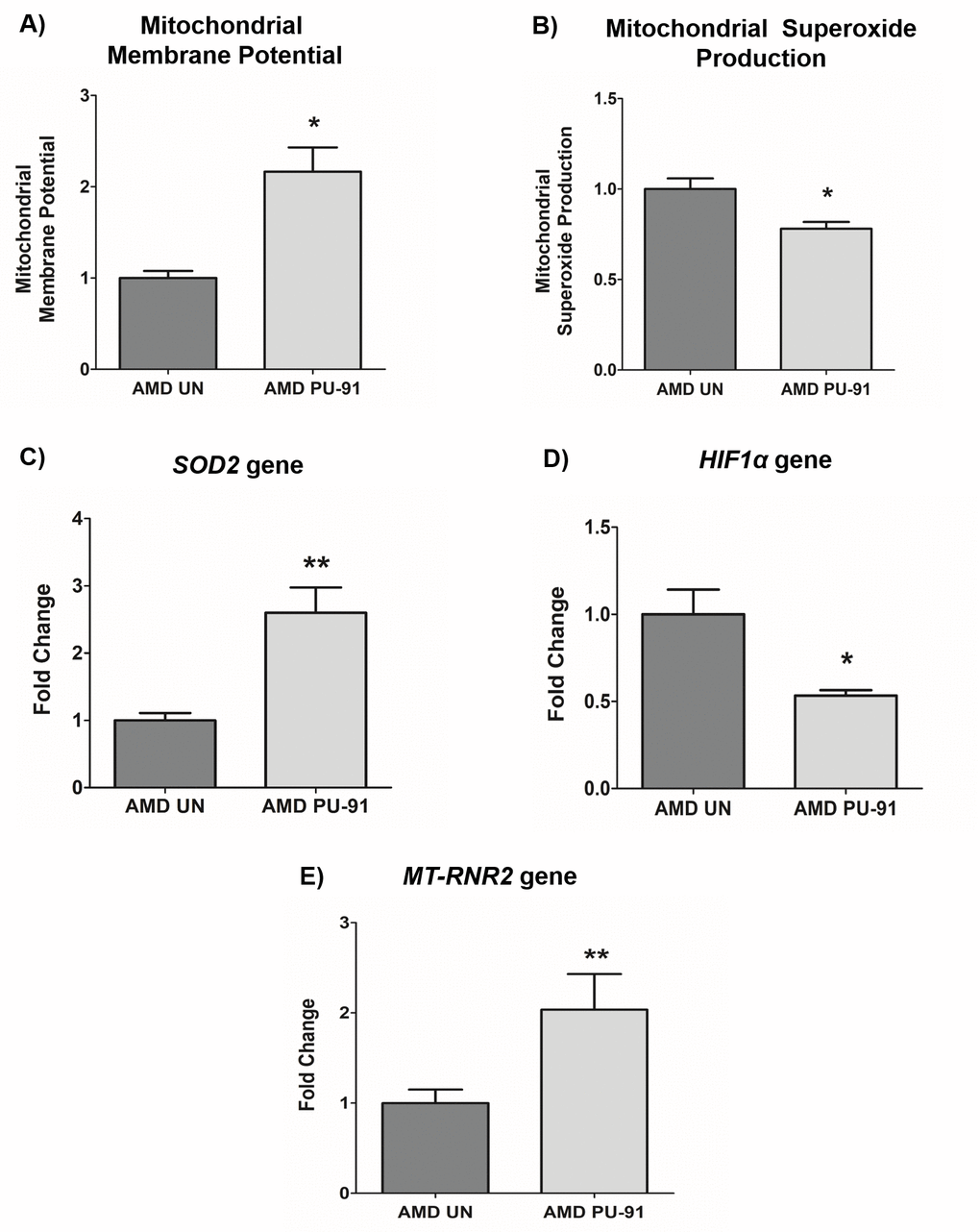 It would be anticipated that transcriptional activation of genes that promote mitochondrial biogenesis would be accompanied by evidence of improved mitochondrial function. As shown in Figure 2, PU-91-treated AMD cybrid cells had increased mitochondrial membrane potential (JC-1 assay) (116% increase; p= 0.03; AMD UN: 1 ± 0.09, n=3; AMD PU-91: 2.16 ± 0.26, n=4), (Figure 2A), and significantly lower levels of mitochondrial superoxides (MitoSOX assay) (22% increase; p=0.04; AMD UN: 1 ± 0.06, n=4; AMD PU-91: 0.78 ± 0.038, n=4), (Figure. 2B). Furthermore, PU-91-treated AMD cells showed upregulation of SOD2, a mitochondrial antioxidant gene, by 160%, (p=0.0079; AMD UN: 1 ± 0.11, n=5; AMD PU-91: 2.6 ± 0.37, n=5) (Figure 2C), and reduced gene expression of HIF1α (47% increase; p=0.03; AMD UN: 1 ± 0.14, n=4; AMD PU-91: 0.53 ± 0.03, n=4) (Figure 2D). PU-91 upregulated MT-RNR2 (Mitochondrially Encoded 16S rRNA) gene in AMD RPE cybrid cells. Treatment with PU-91 drug caused a 104% higher expression of MT-RNR2 gene in AMD RPE cybrid cells (p=0.0079; AMD UN: 1 ± 0.15, n=5; AMD PU-91: 2.04 ± 0.39 n=5) (Figure 2E), suggesting that increased production of Mitochondrial Derived Peptides (MDPs) could be one of the mechanisms by which PU-91 rescues cells.