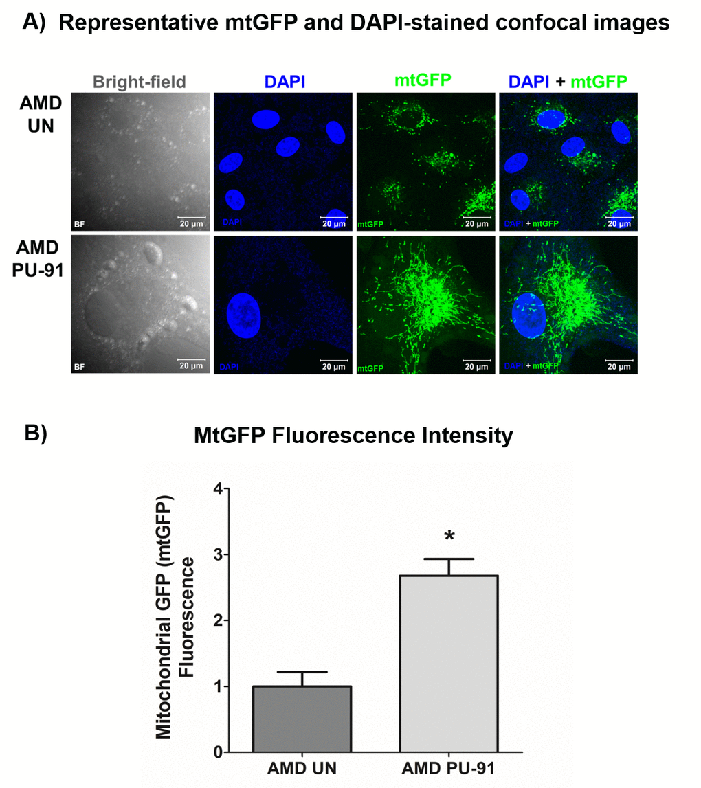 PU-91 enhances mitochondrial GFP (mtGFP) fluorescence in AMD RPE cells