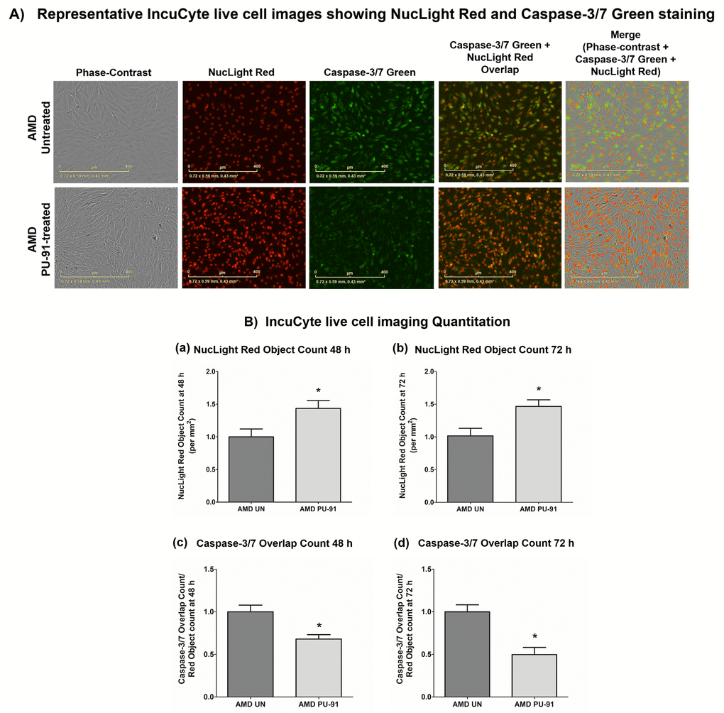 We have established previously that dysfunctional mitochondria in the AMD cybrids contribute to activation of cleaved Caspase-3 and BAX, which are markers of cell apoptosis [9]. Other studies have demonstrated the role of apoptotic and necrotic cascades in death of retinal cells in AMD [60,61]. Therefore, treatment with drugs that inhibit apoptosis is essential to prevent retinal cell loss and to preserve cellular heath. We observed higher number of viable cells and downregulation of Caspase-3 and BAX genes in PU-91-treated AMD cybrids, indicating that PU-91 prevents mitochondria-induced apoptotic cell death in these cells. Next, we compared cell proliferation and apoptosis between untreated and PU-91-treated AMD cells using IncuCyte® Live-Cell Imaging Analysis system and Caspase- 3/7 Green and NucLight Red reagents. PU-91-treated AMD cells showed significantly higher NucLight Red object count at the 48 h and 72 h compared to untreated AMD cells. Furthermore, as hypothesized, PU-91-treated AMD cells showed lower Overlap object count (i.e., Caspase-3/7 Green + NucLight Red staining (Yellow))/ Red object count compared to their untreated counterparts. Our IncuCyte data revealed that PU-91 enhanced cell proliferation and reduced Caspase-3/7 activity in AMD cybrids. To our knowledge, this is the first study to report these findings.