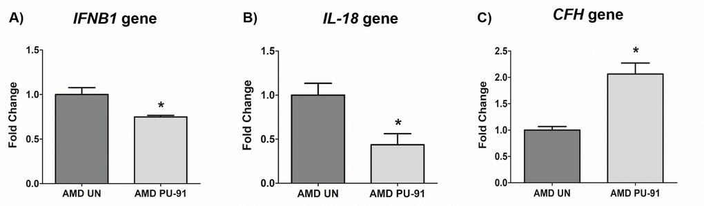 Molecular correlates of AMD include chronic inflammation and dysregulation of the complement pathway. We sought to determine whether PU-91 regulated these pathogenic features. Treatment with PU-91 altered the gene expression of inflammatory markers, IFNB1 (25% decrease; p=0.03; AMD UN: 1 ± 0.08, n=4; AMD PU-91: 0.75 ± 0.02, n=4) (Figure 6A), IL-18 (56% decrease; p=0.03; AMD UN: 1 ± 0.13, n=4; AMD PU-91: 0.44 ± 0.12, n=4) (Figure 6B), and of a complement inhibitor CFH (106% increase; p=0.03; AMD UN: 1 ± 0.07, n=4; AMD PU-91: 2.06 ± 0.21, n=3) (Figure 6C).