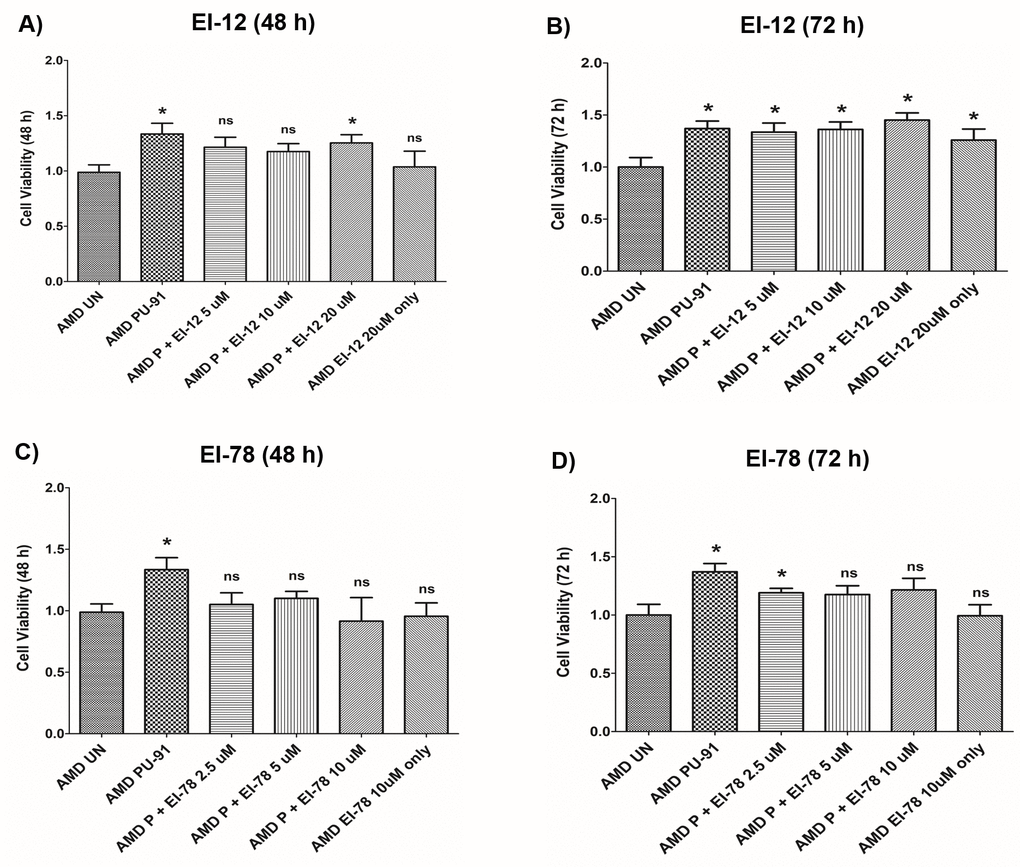 No significant changes in cell viability were observed between AMD cells treated with only PU-91 and those treated with PU-91+EI-12 or PU-91+EI-78 (Supplementary Tables 2 and 3).