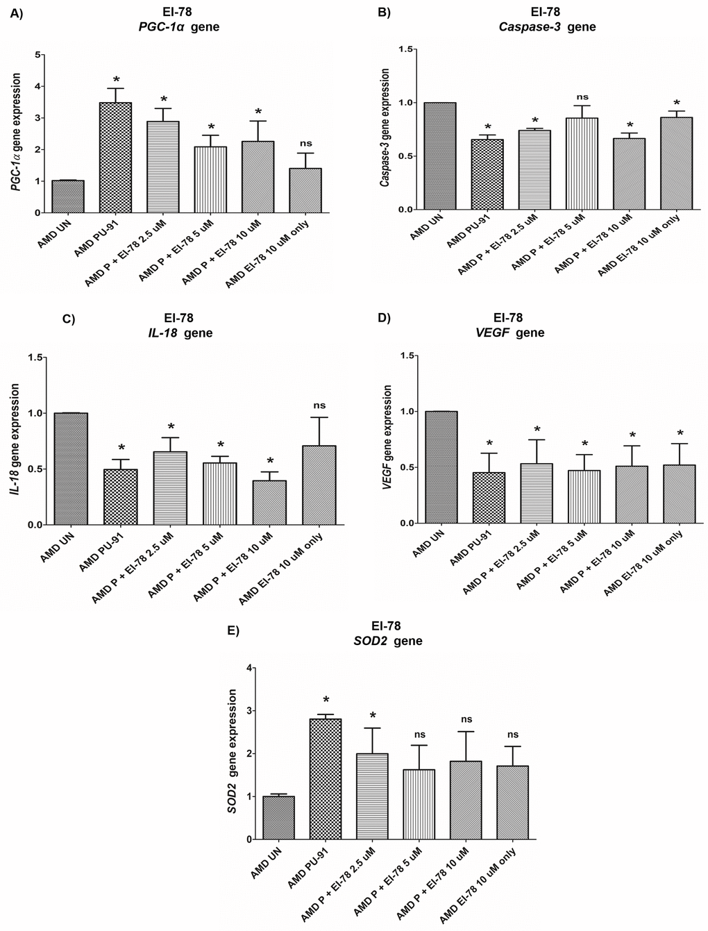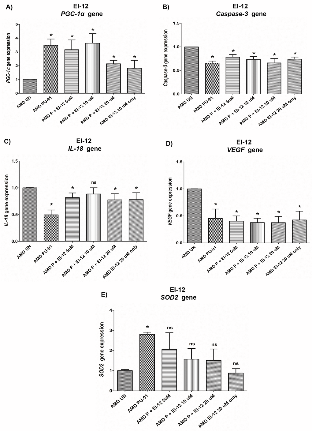 We extended the observations of PU-91 with esterase inhibitors EI-12 and EI-78, on gene expression changes. Treatment with PU-91 + EI-12/ EI-78 at different concentrations i.e., EI-12: 5 μΜ, 10 μΜ, and 20 μΜ; EI-78: 2.5 μΜ, 5 μΜ, and 10 μΜ altered the expression of PGC-1α, Caspase-3, IL-18, VEGF, SOD2 genes in AMD RPE cybrid cells (n=3) at the 72 h time point.