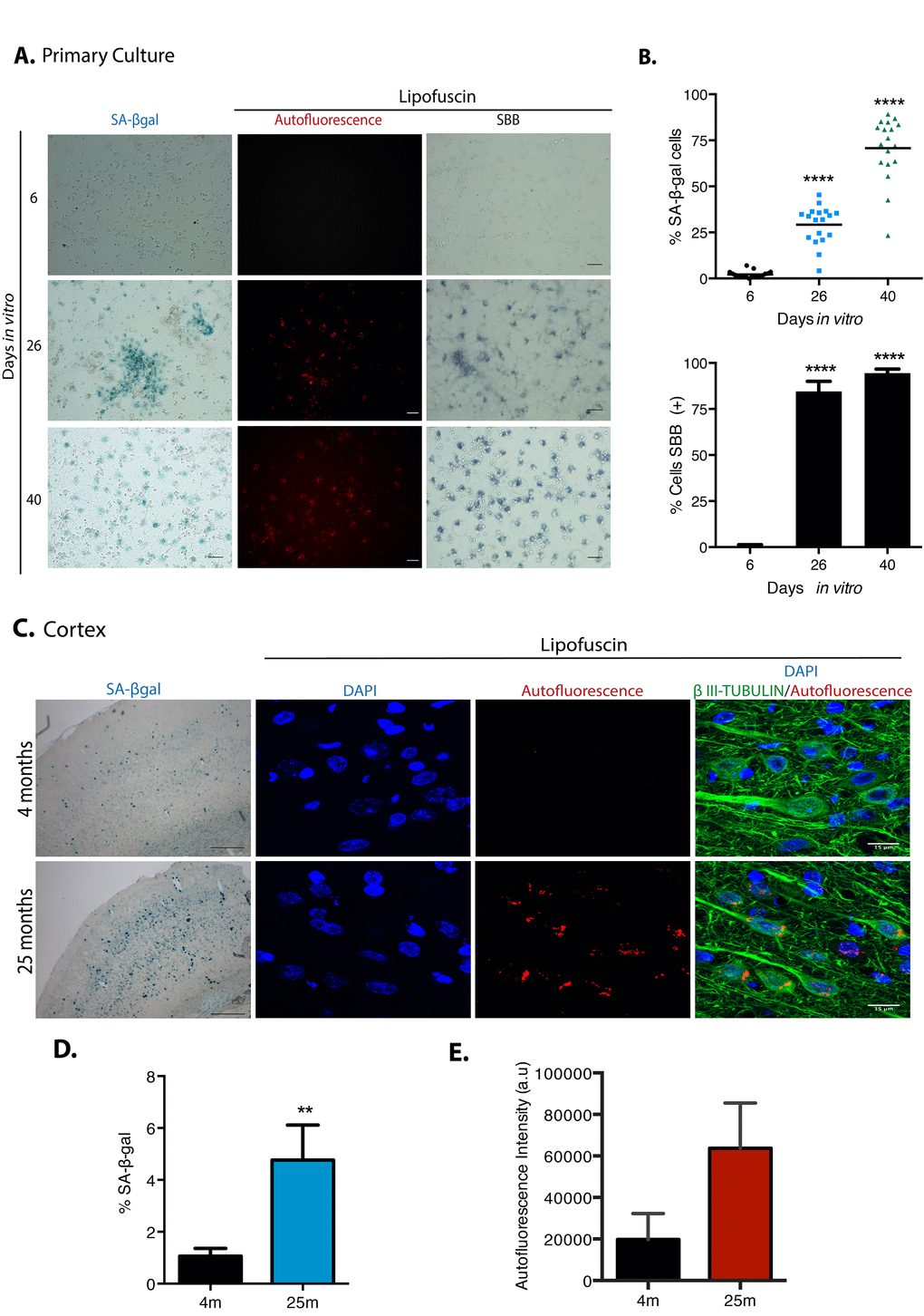 To establish an in vitro model to study the transition of neurons from a non-dividing terminal differentiation state into senescence in vitro, prenatal rat cortical cells were cultured for up to 40 days in vitro (DIV). Since several reports indicate the presence of senescent glial cells in old brains [13], we considered that glial cells could become senescent and then promote paracrine neuronal senescence; hence, we allowed the proliferation of glial cells during the culture of primary cortical cells. During the first days of culture (6 DIV), neurons (expressing βIII-TUBULIN) represented 96.8% (SD 2.2) of the cells with very few glial cells (expressing GFAP); due to proliferation of glial cells and some loss of neurons, by 26 DIV there were 51% (SD 6.9) neurons and 31% (SD 11.5) glial cells; and by 40 DIV 73% (SD 6.9) of the surviving cells were glial. The cells expressing βIII-TUBULIN did not expressed GFAP. On average, the total number of cells along the culture remained similar (Supplementary Figure 1S). Without any further stressful stimuli, cortical cells became SA-β-gal-positive over time and accumulated lipofuscin detected by autofluorescence and by Sudan Black B staining, a lipophilic dye [24] (Figures 1A-B). SBB staining seems to be more sensitive than SA-β-gal activity. An increment in both SA-β-gal-positive and lipofuscin accumulation was also confirmed in the cortex of old rat brains (Figures 1C-E).