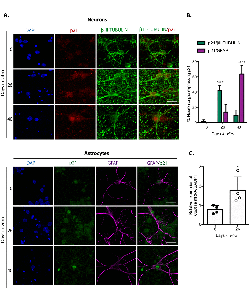 Since different inducers of senescence in mitotic cells converge on the activation of the tumor suppressor p21CIP1/WAF1, and indeed p21CIP1/WAF1 has been suggested to mediate neuronal senescence in old brains [15], we reasoned that even though post-mitotic cells already express some CDK inhibitors to exit the cell cycle, they could still need to induce its expression for a pro-senescent activity from this protein. Therefore, we analyzed its expression on neurons or glial cells at different times of culture. As shown in Figure 2, in primary culture of cortical cells incubated 26 DIV, neurons but not yet glial cells expressed higher levels of p21CIP1/WAF1. The number of glial cells with elevated expression of p21CIP1/WAF1 increased until 40 DIV. This observation suggests that neurons acquire senescent features before glial cells. Interestingly, at 26 DIV p21CIP1/WAF1 is slightly enriched at the nuclear periphery. This could be related to the recent finding that altered nuclear export is a common hallmark of aging [25]. We confirmed p21CIP1/WAF1 expression is induced at transcriptional level in cortical cells at 26 DIV by qRT-PCR (Figure 2C).